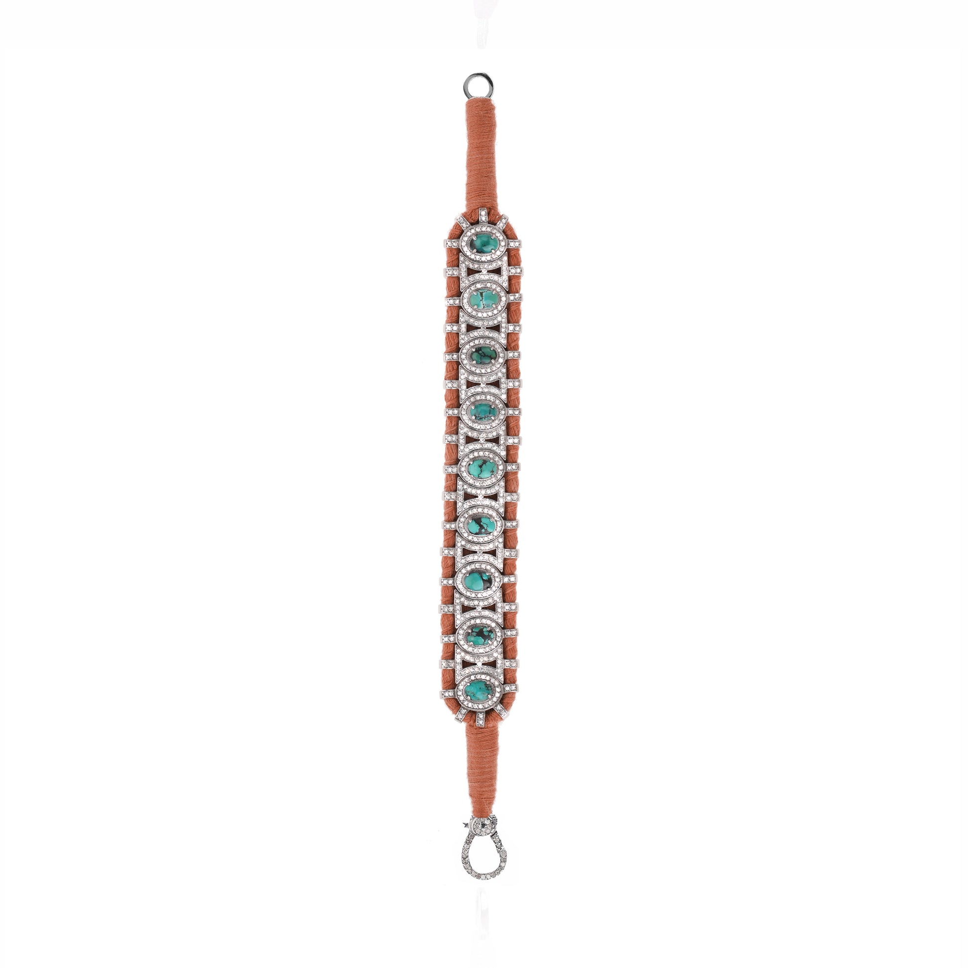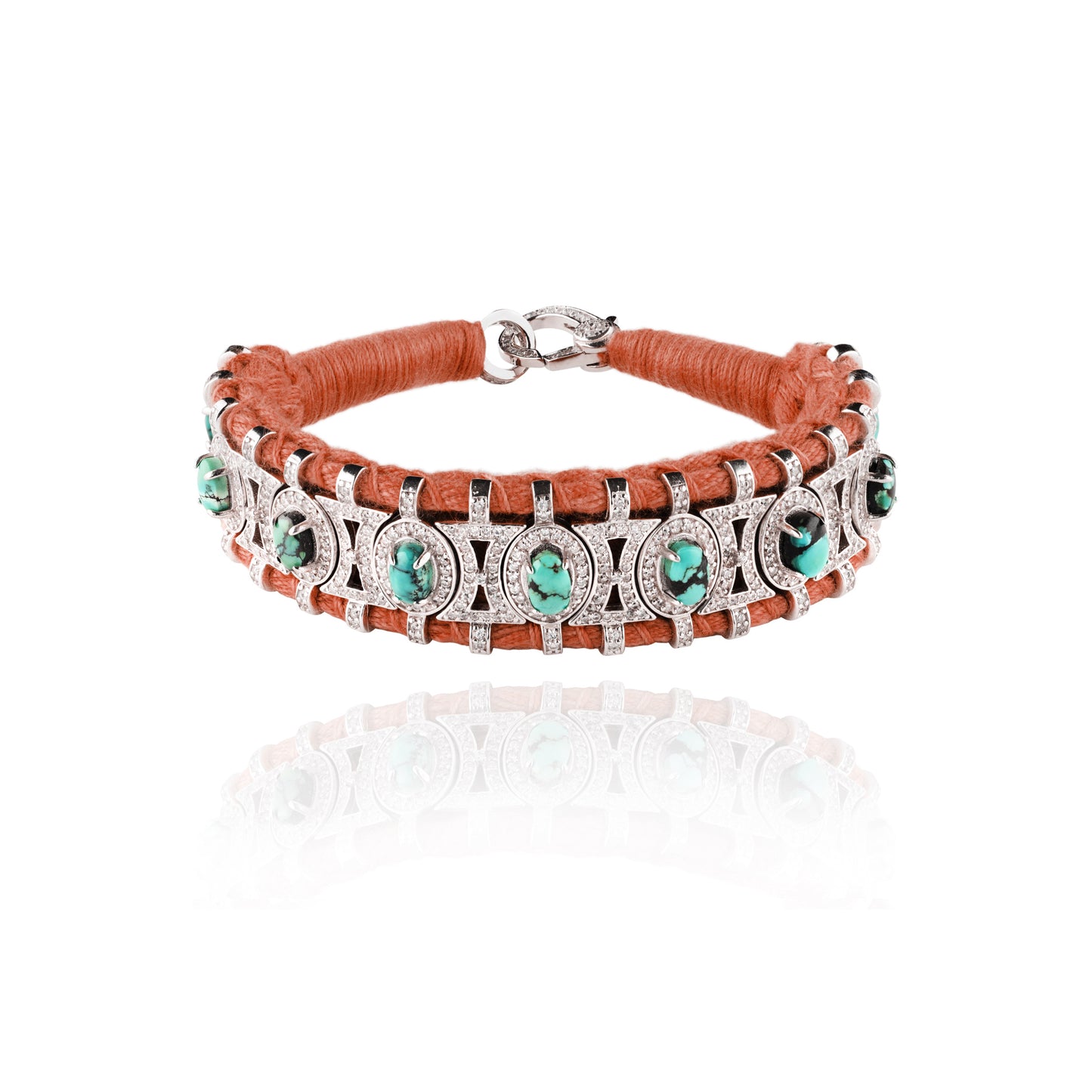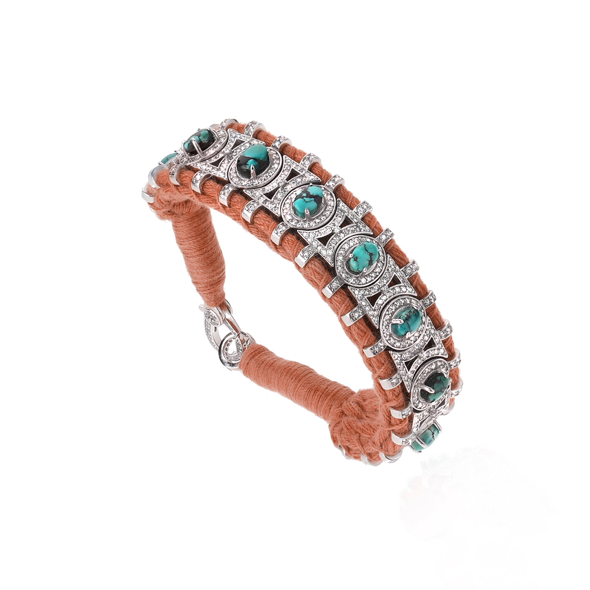 Bracelet en fil de coton tressé de couleur blush, décoré d’un motif en argent 925 et serti d’une multitude de diamants. Il est décoré de splendides turquoises véritables.