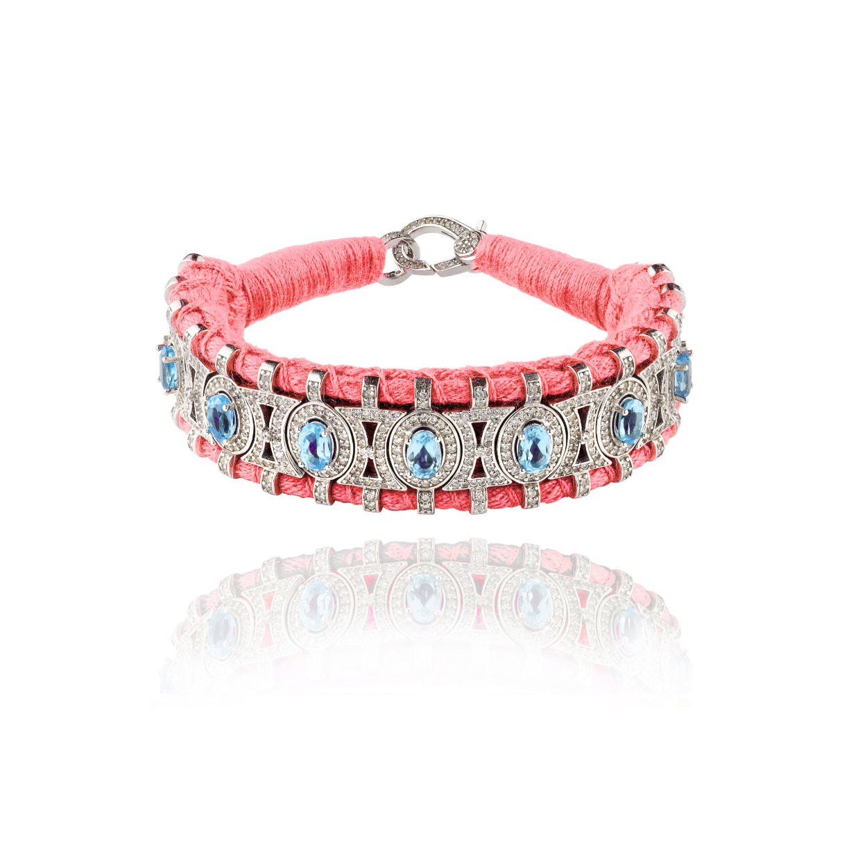 Ce bracelet en fil couleur brass sera votre porte-bonheur bohème de l’été. Il est intégralement décoré d’argent formant un motif ovale serti de plus de 300 diamants. Chaque petit ovale est magnifiquement décoré d’une topaze centrale. Il sera pour toujours, votre friendship bracelet au style précieux et ne quittera plus votre poignet.