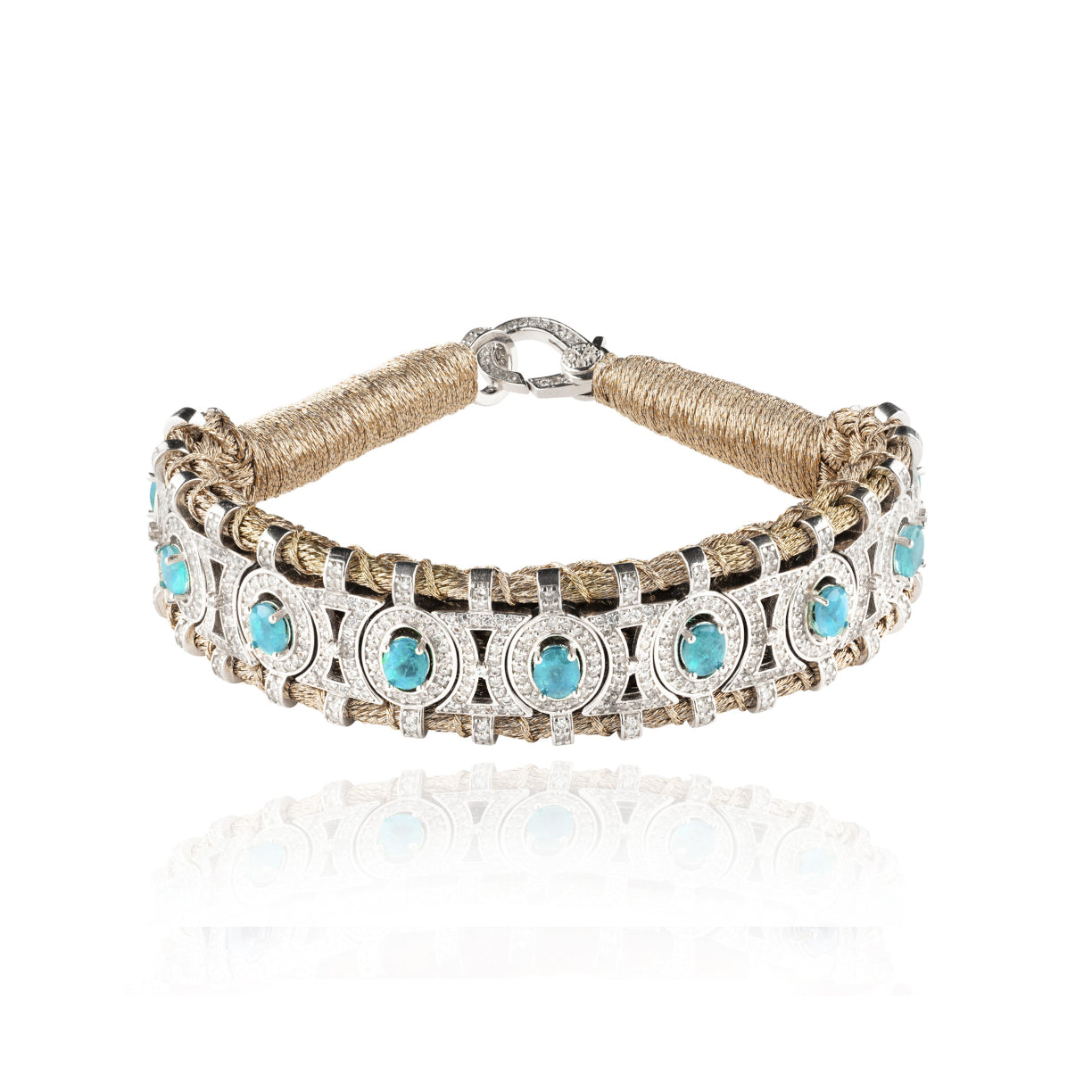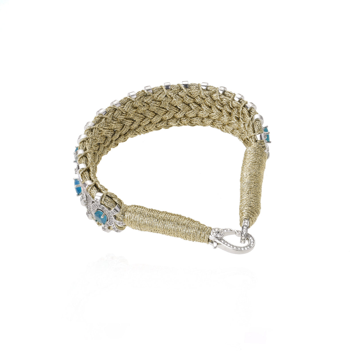 Bracelet en fil de lurex tressé de couleur brass, décoré d’un motif en argent 925 et serti d’une multitude de diamants. Il est décoré de splendides topazes véritables.