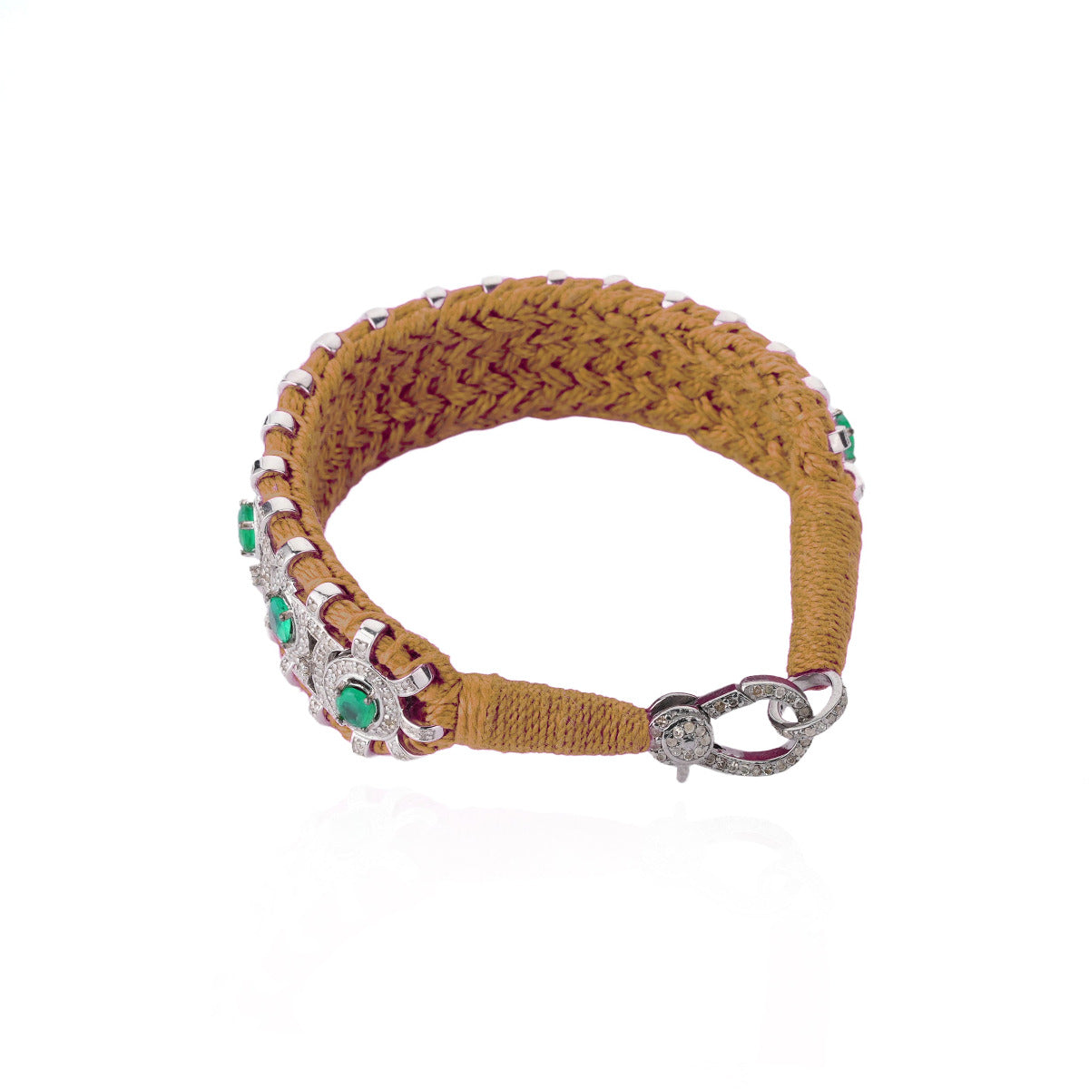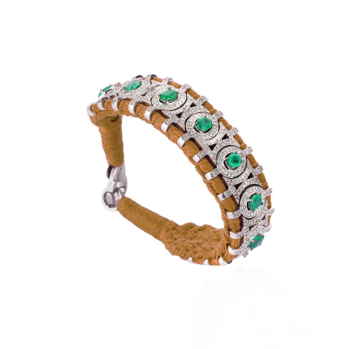 Bracelet en fil de coton tressé de couleur camel, décoré d’un motif en argent 925 et serti d’une multitude de diamants. Il est décoré de splendides émeraudes véritables.