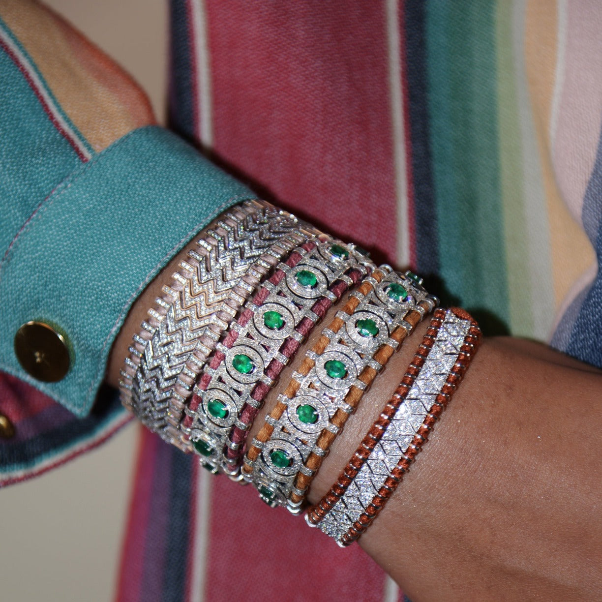Ce bracelet en fil couleur camel sera votre porte-bonheur bohème de l’été. Il est intégralement décoré d’argent formant un motif ovale serti de plus de 300 diamants. Chaque petit ovale est magnifiquement décoré d’une émeraude centrale. Il sera pour toujours, votre friendship bracelet au style précieux et ne quittera plus votre poignet.