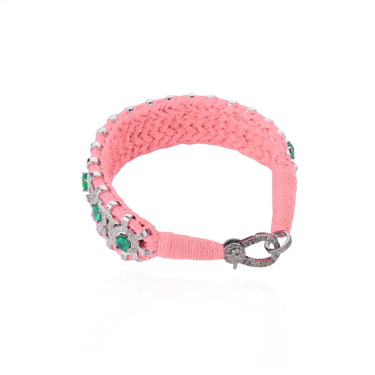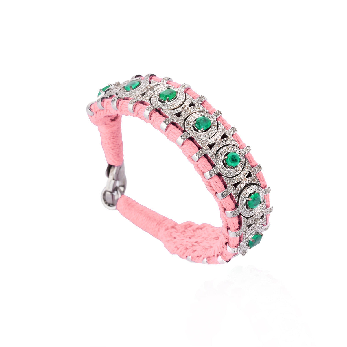 Ce bracelet en fil couleur rose fluo sera votre porte-bonheur bohème de l’été. Il est intégralement décoré d’argent formant un motif ovale serti de plus de 300 diamants. Chaque petit ovale est magnifiquement décoré d’une émeraude centrale. Il sera pour toujours, votre friendship bracelet au style précieux et ne quittera plus votre poignet.