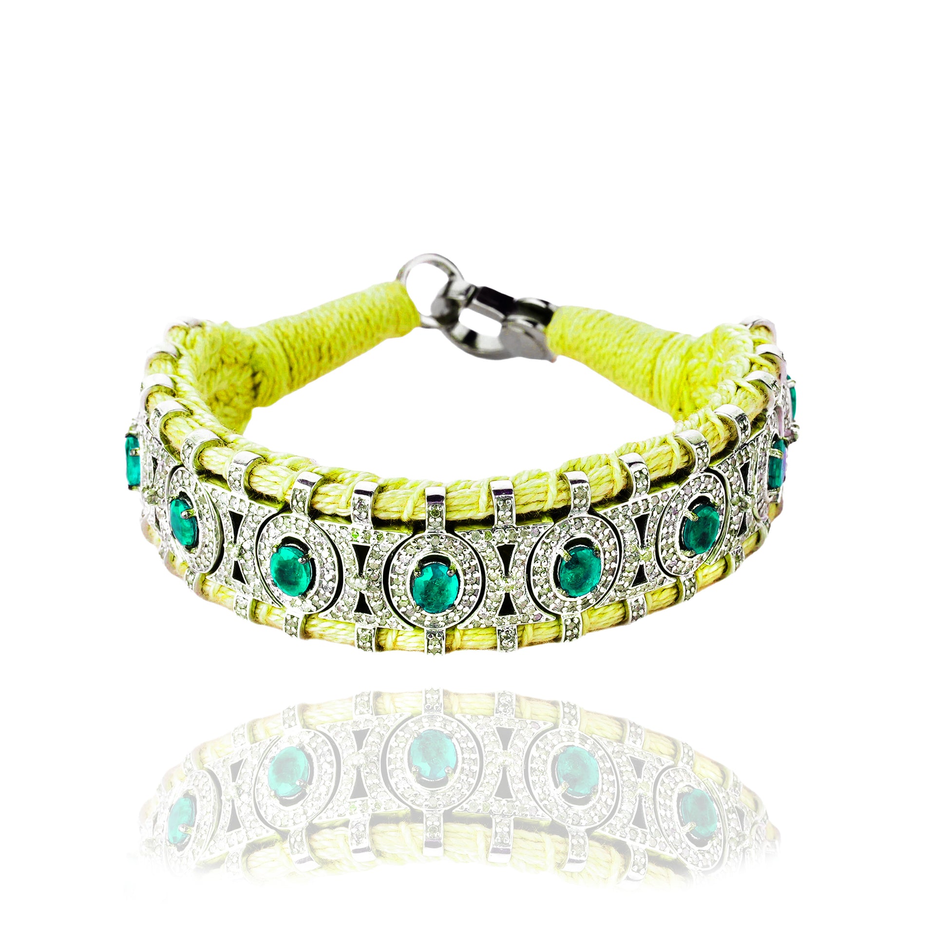 Ce bracelet en fil couleur jaune fluo sera votre porte-bonheur bohème de l’été. Il est intégralement décoré d’argent formant un motif ovale serti de plus de 300 diamants. Chaque petit ovale est magnifiquement décoré d’une émeraude centrale. Il sera pour toujours, votre friendship bracelet au style précieux et ne quittera plus votre poignet.