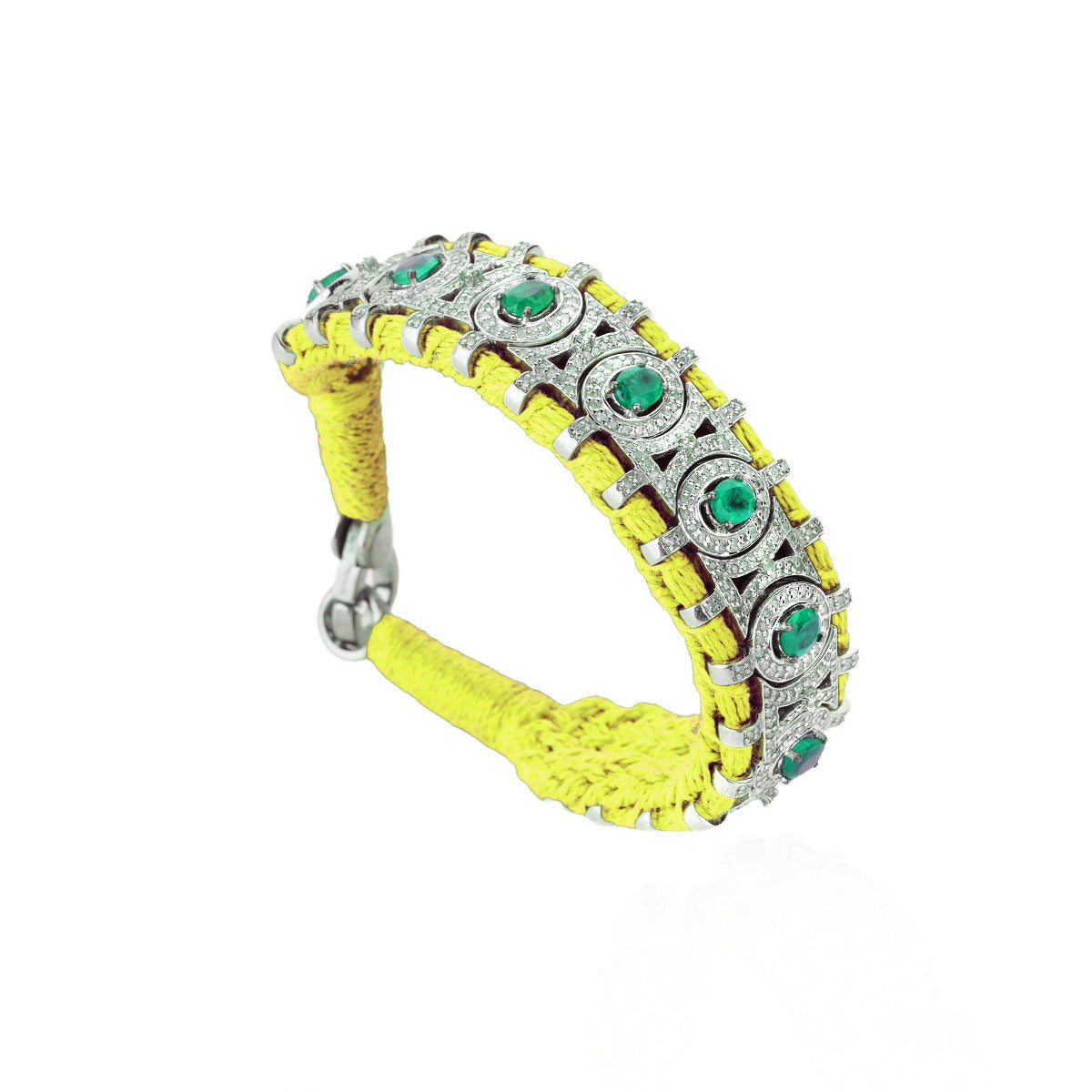 Bracelet en fil de coton tressé de couleur jaune fluo, décoré d’un motif en argent 925 et serti d’une multitude de diamants. Il est décoré de splendides émeraudes véritables.