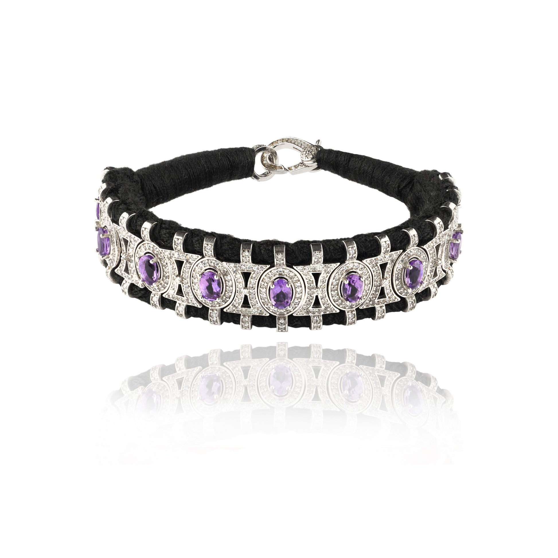 Bracelet en fil de coton tressé de couleur noir, décoré d’un motif en argent 925 et serti d’une multitude de diamants. Il est décoré de splendides améthystes véritables.