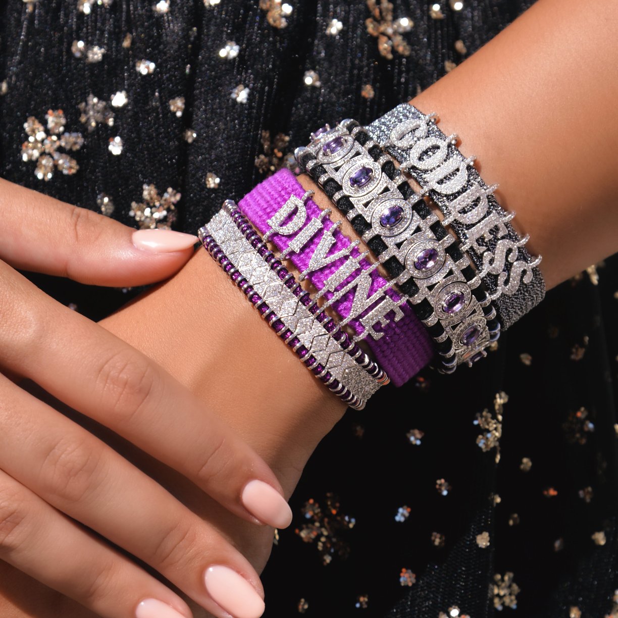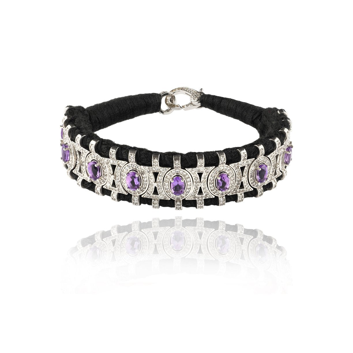 Ce bracelet en fil couleur noir sera votre porte-bonheur bohème de l’été. Il est intégralement décoré d’argent formant un motif ovale serti de plus de 300 diamants. Chaque petit ovale est magnifiquement décoré d’une améthyste centrale. Il sera pour toujours, votre friendship bracelet au style précieux et ne quittera plus votre poignet.