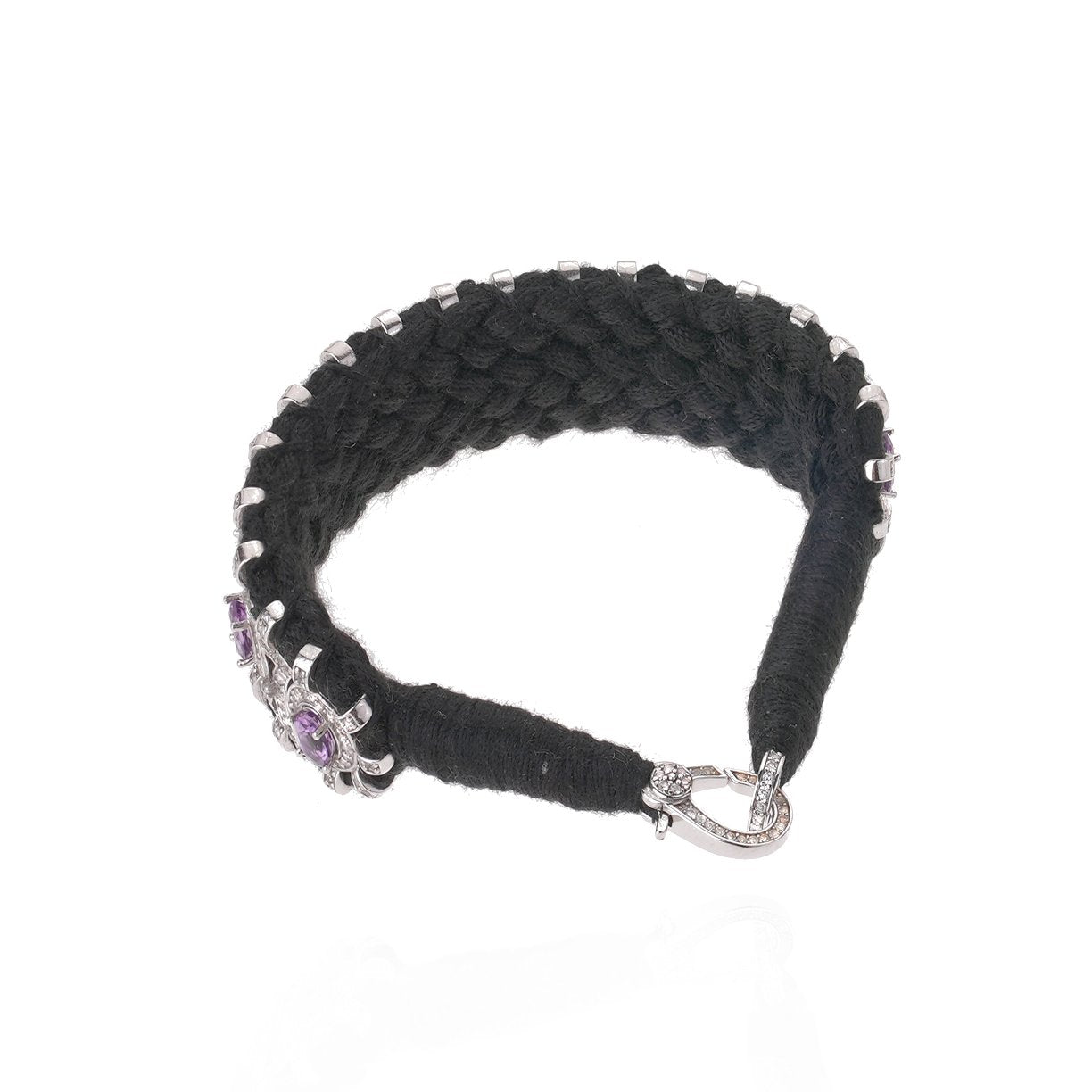 Bracelet en fil de coton tressé de couleur noir, décoré d’un motif en argent 925 et serti d’une multitude de diamants. Il est décoré de splendides améthystes véritables.