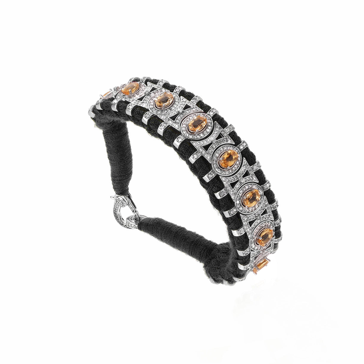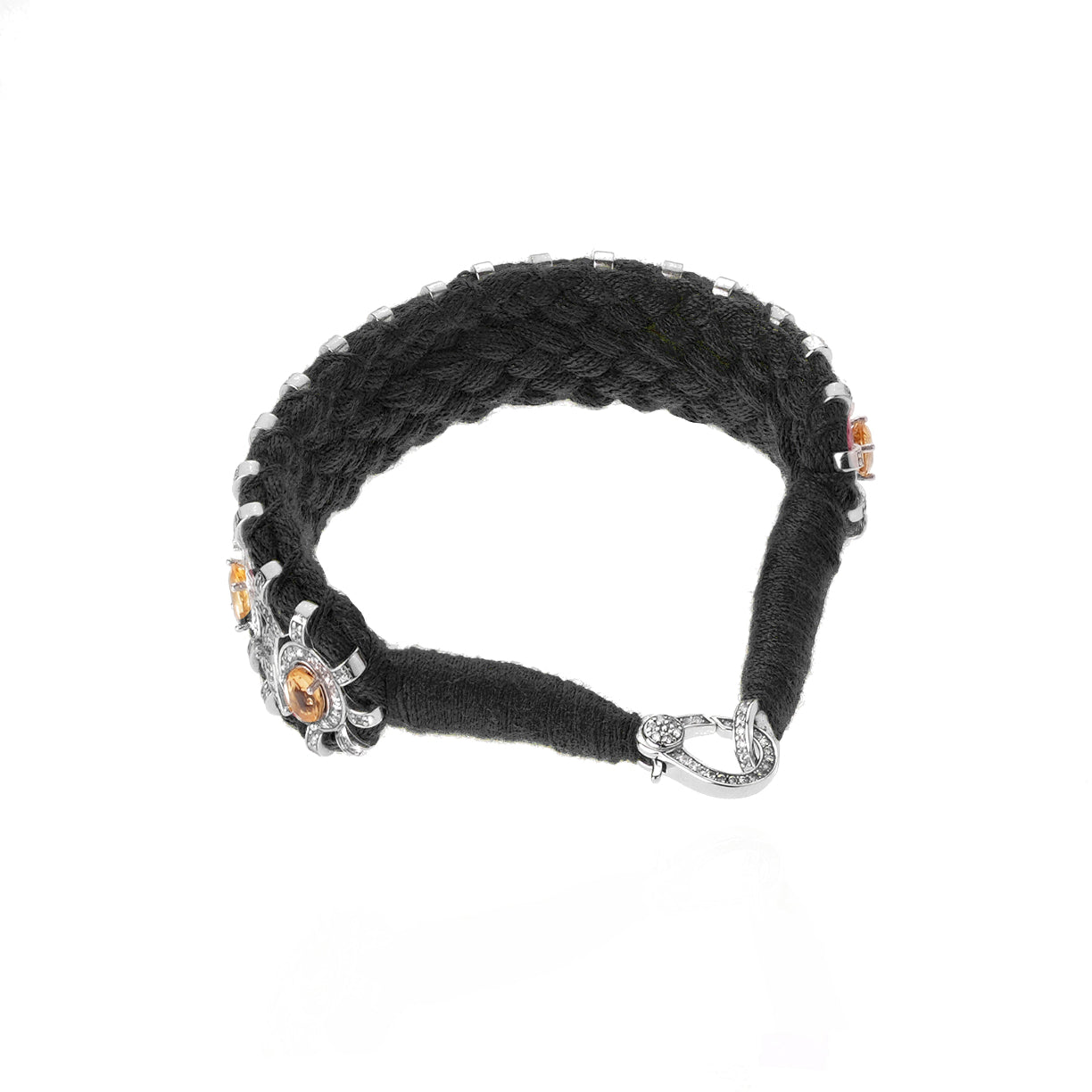 Bracelet en fil de coton tressé noir, décoré d’un motif en argent 925 et serti d’une multitude de diamants. Il est décoré de splendides citrines véritables.
