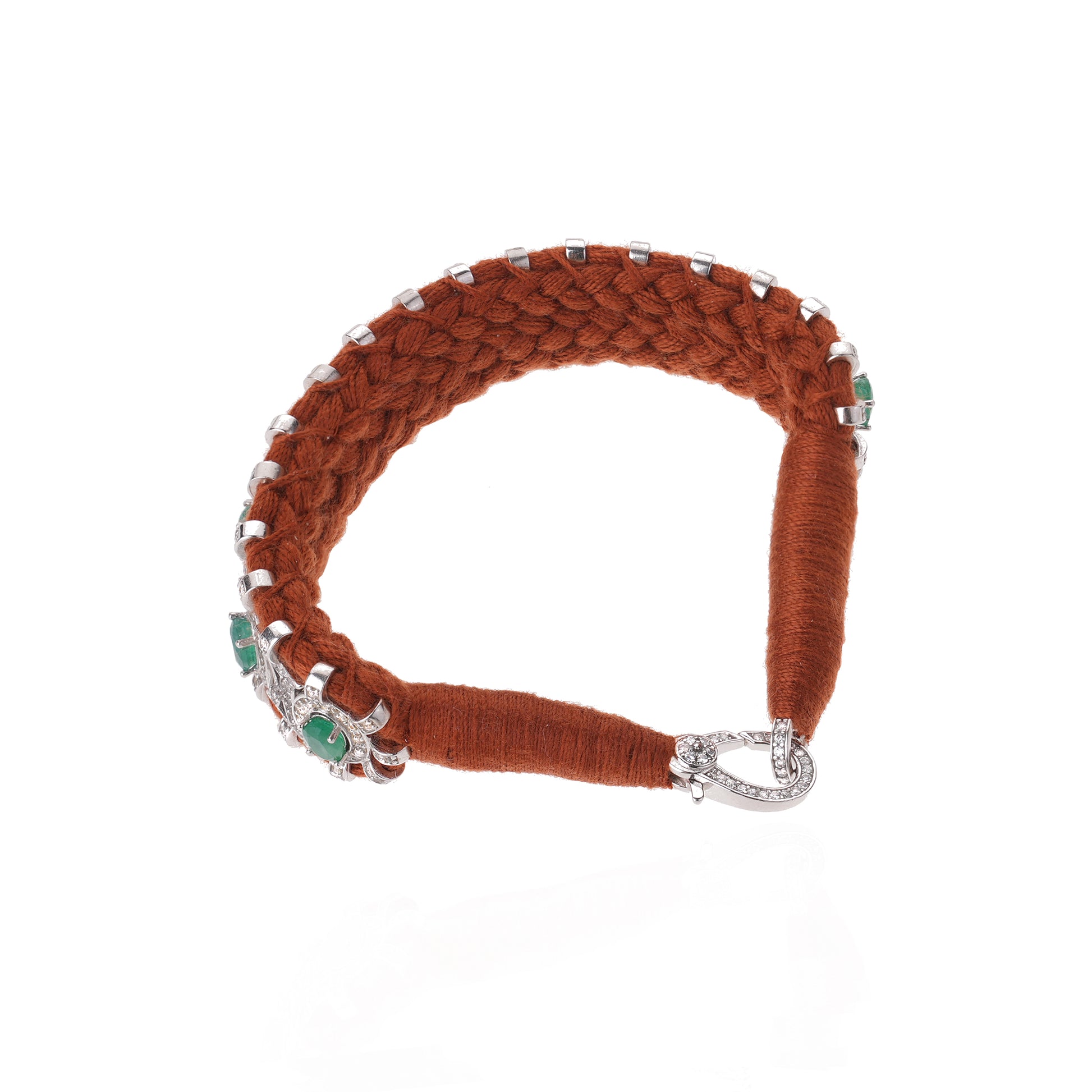 Bracelet en fil de coton tressé de couleur noisette, décoré d’un motif en argent 925 et serti d’une multitude de diamants. Il est décoré de splendides émeraudes véritables.
