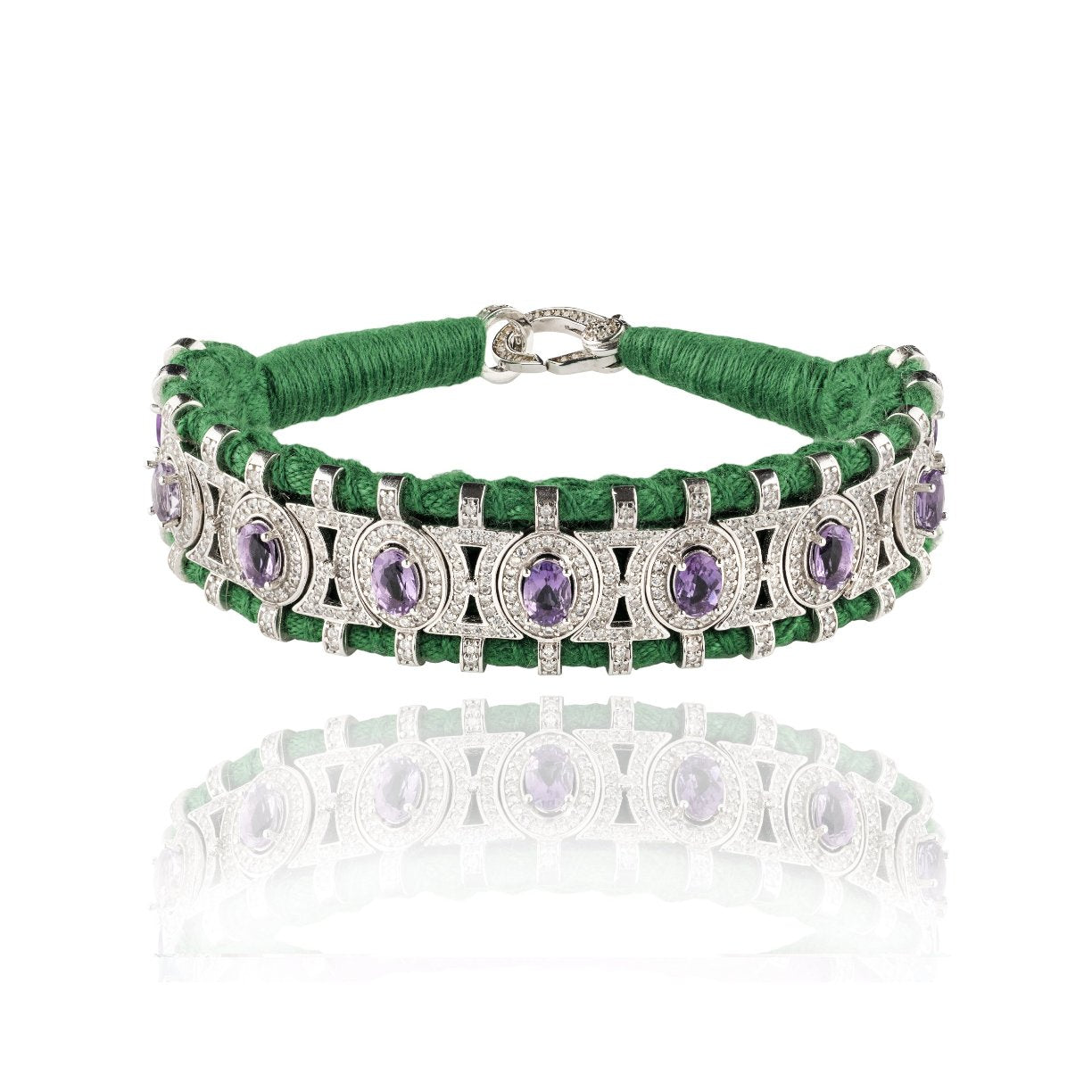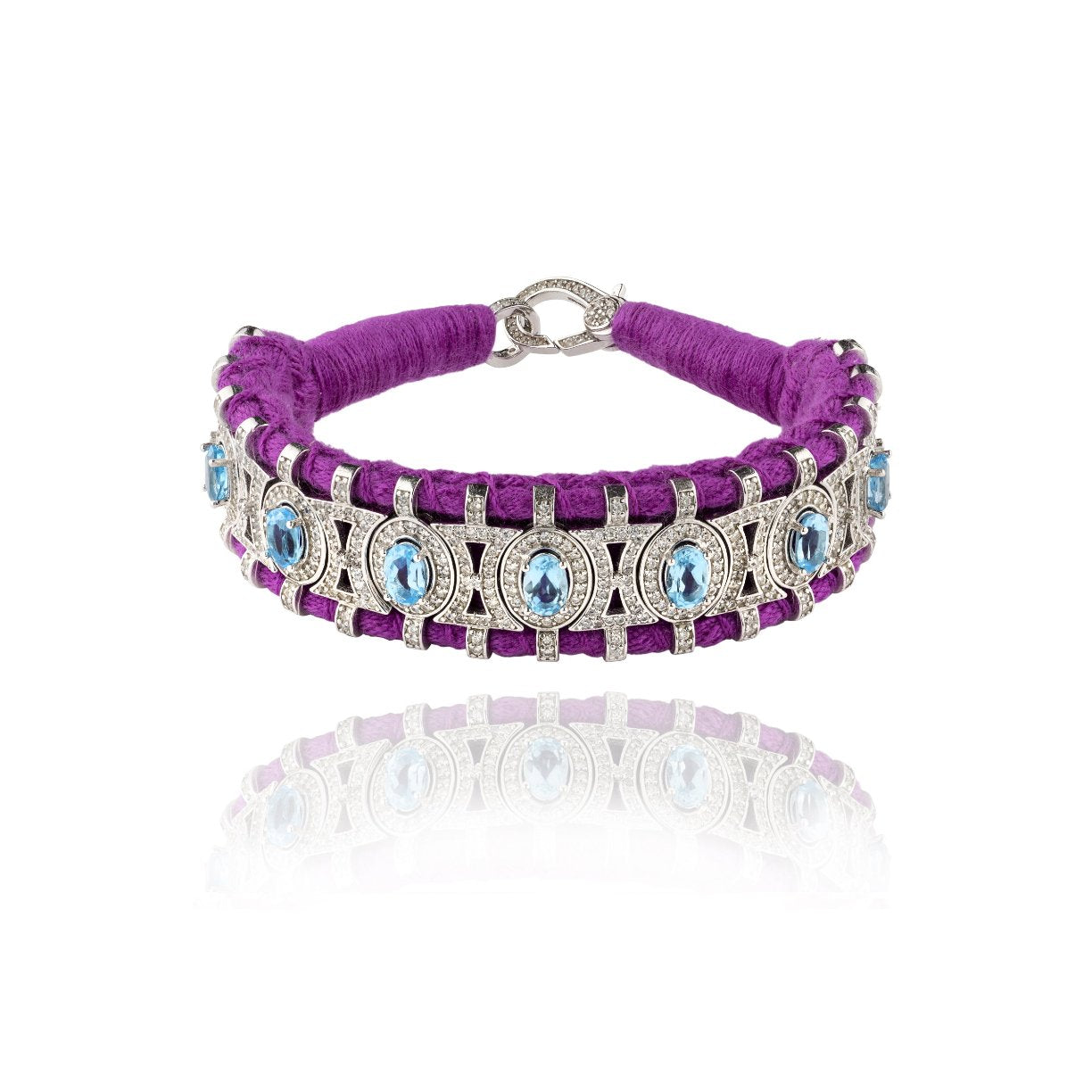 Ce bracelet en fil couleur nude sera votre porte-bonheur bohème de l’été. Il est intégralement décoré d’argent formant un motif ovale serti de plus de 300 diamants. Chaque petit ovale est magnifiquement décoré d’une turquoise centrale. Il sera pour toujours, votre friendship bracelet au style précieux et ne quittera plus votre poignet.