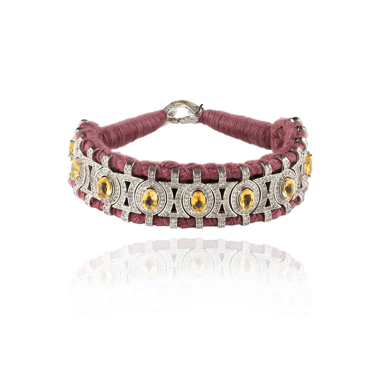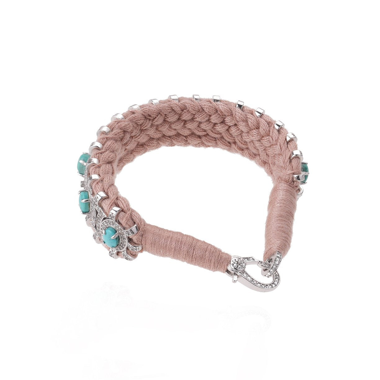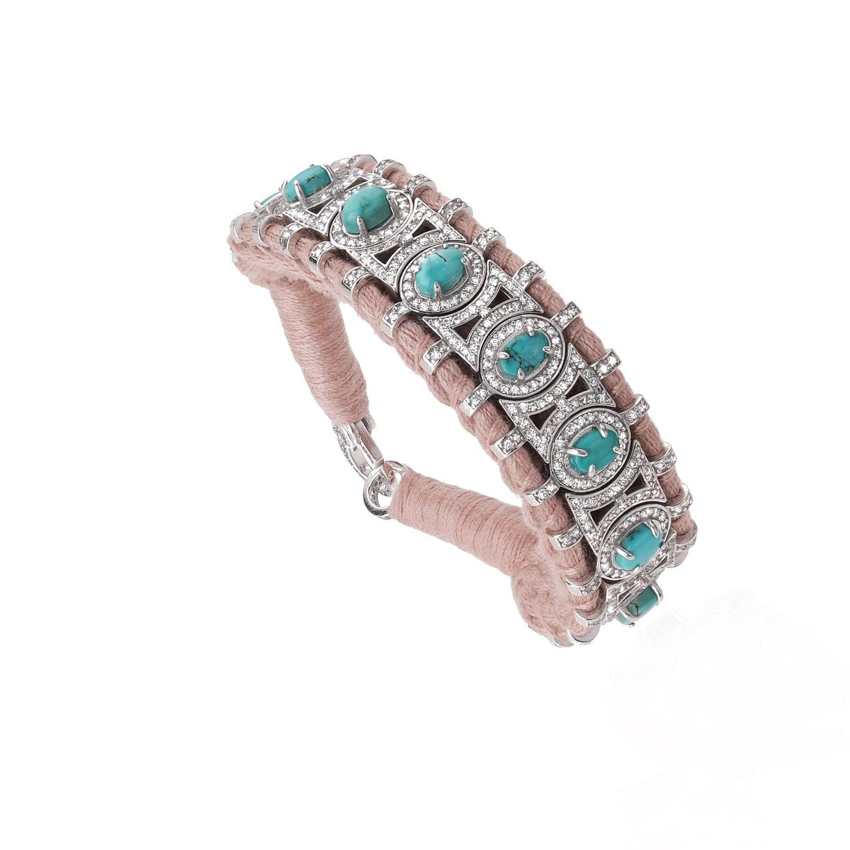 Bracelet en fil de coton tressé de couleur nude, décoré d’un motif en argent 925 et serti d’une multitude de diamants. Il est décoré de splendides turquoises véritables.