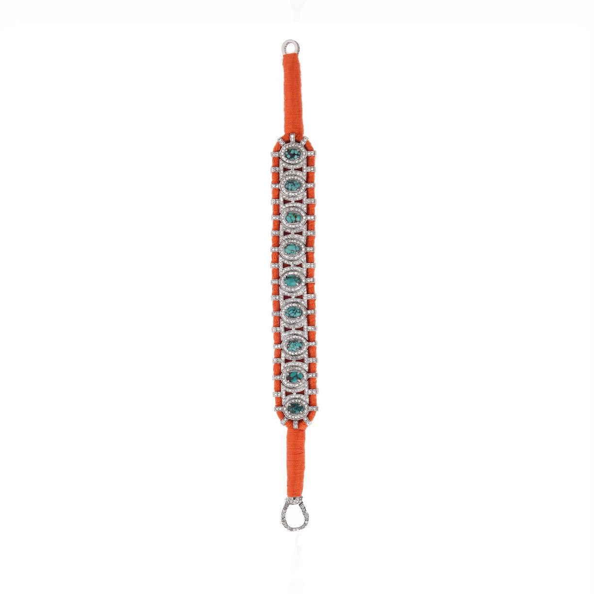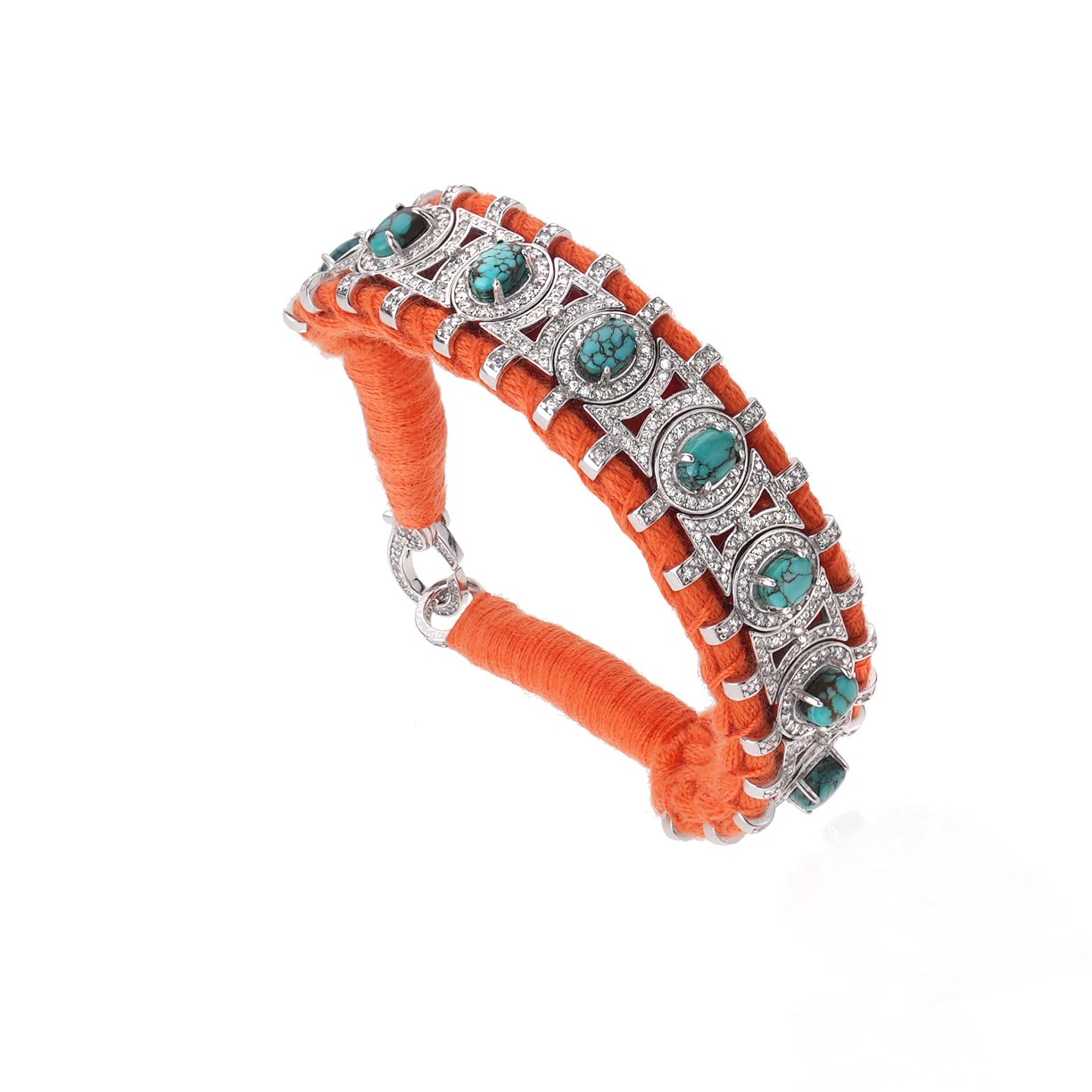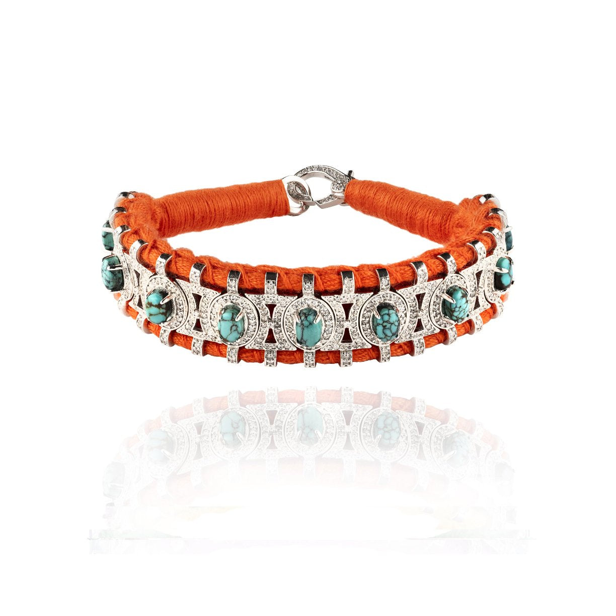 Bracelet en fil de coton tressé de couleur orange, décoré d’un motif en argent 925 et serti d’une multitude de diamants. Il est décoré de splendides turquoises véritables.
