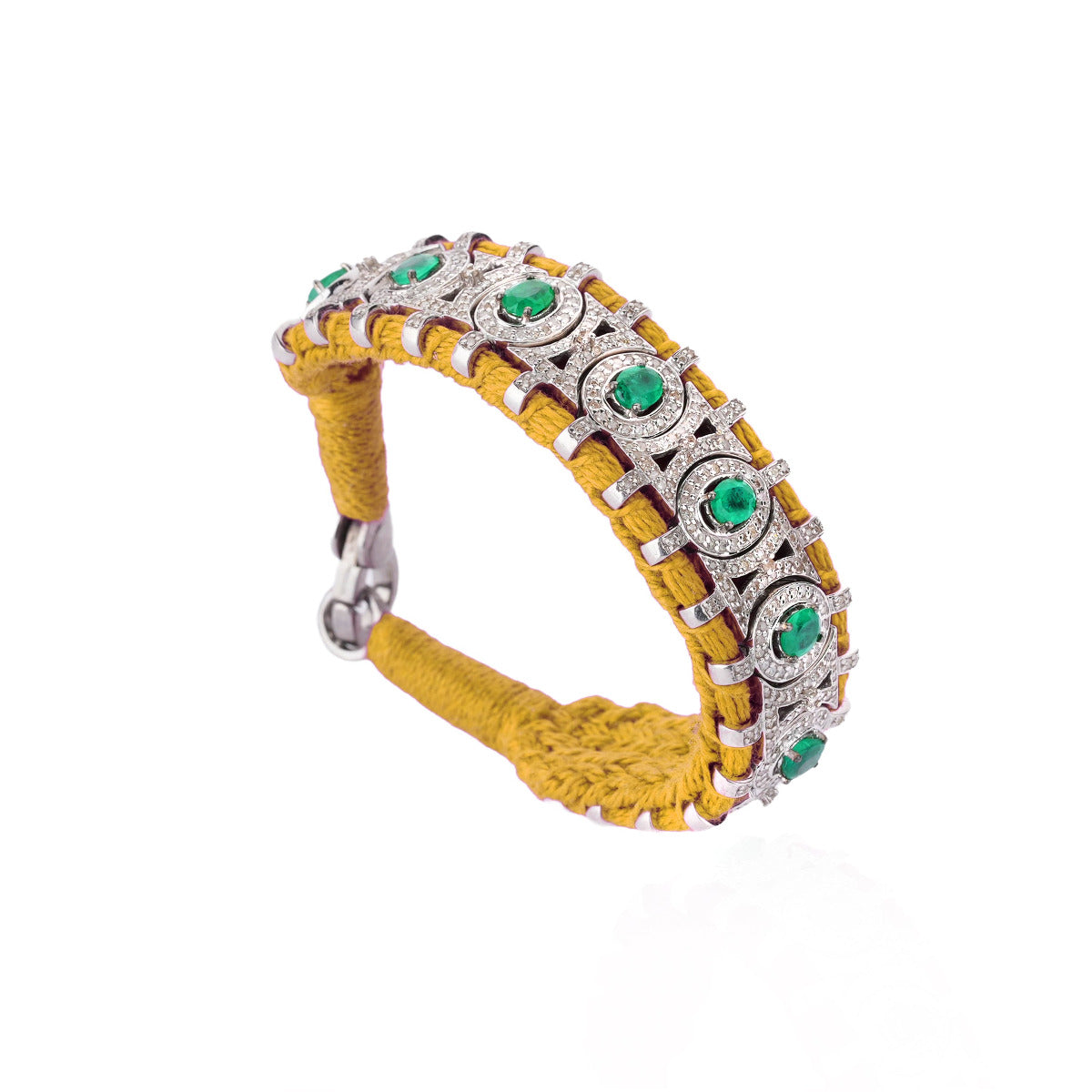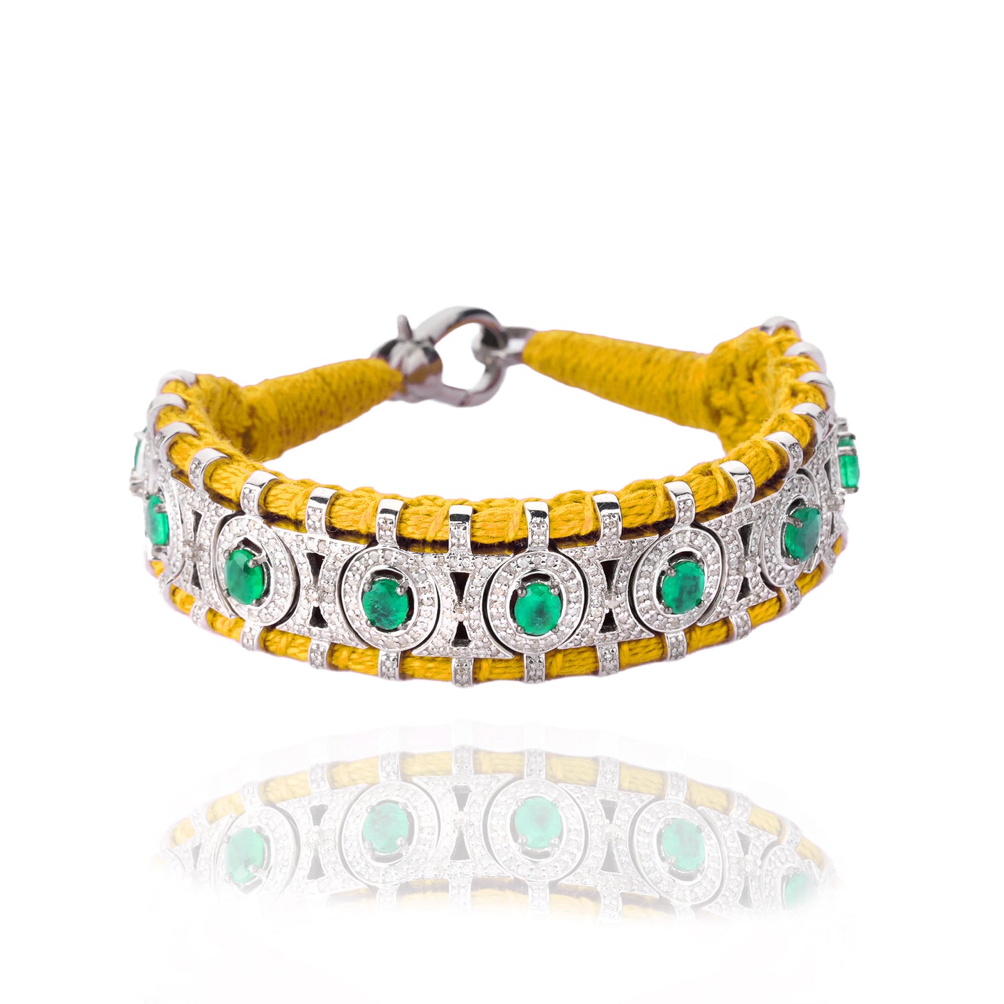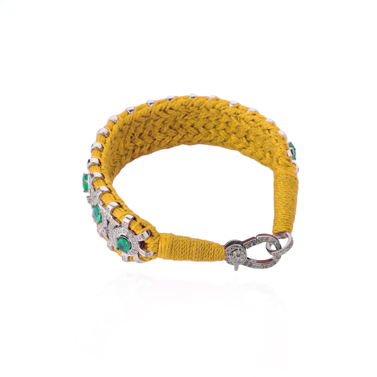 Bracelet en fil de coton tressé de couleur safran, décoré d’un motif en argent 925 et serti d’une multitude de diamants. Il est décoré de splendides émeraudes véritables.