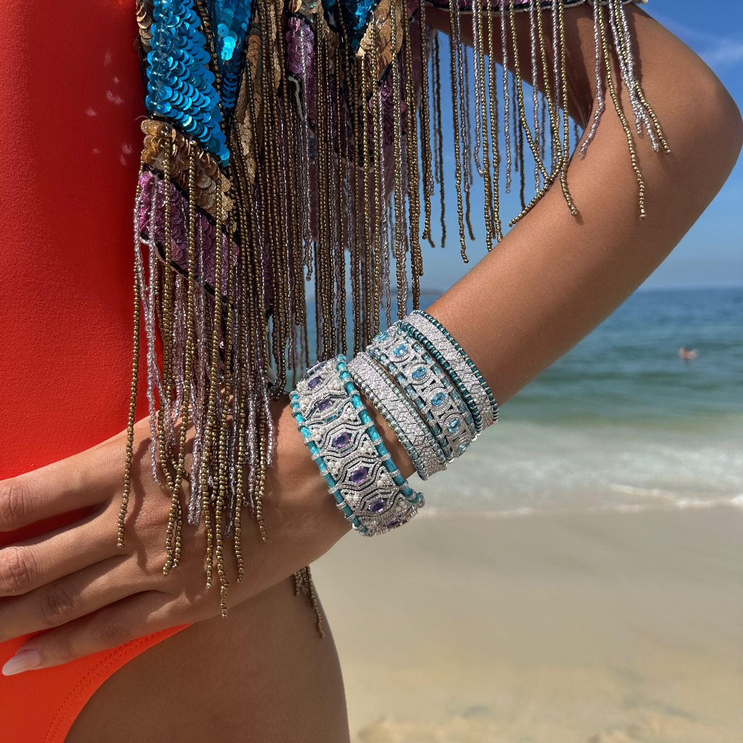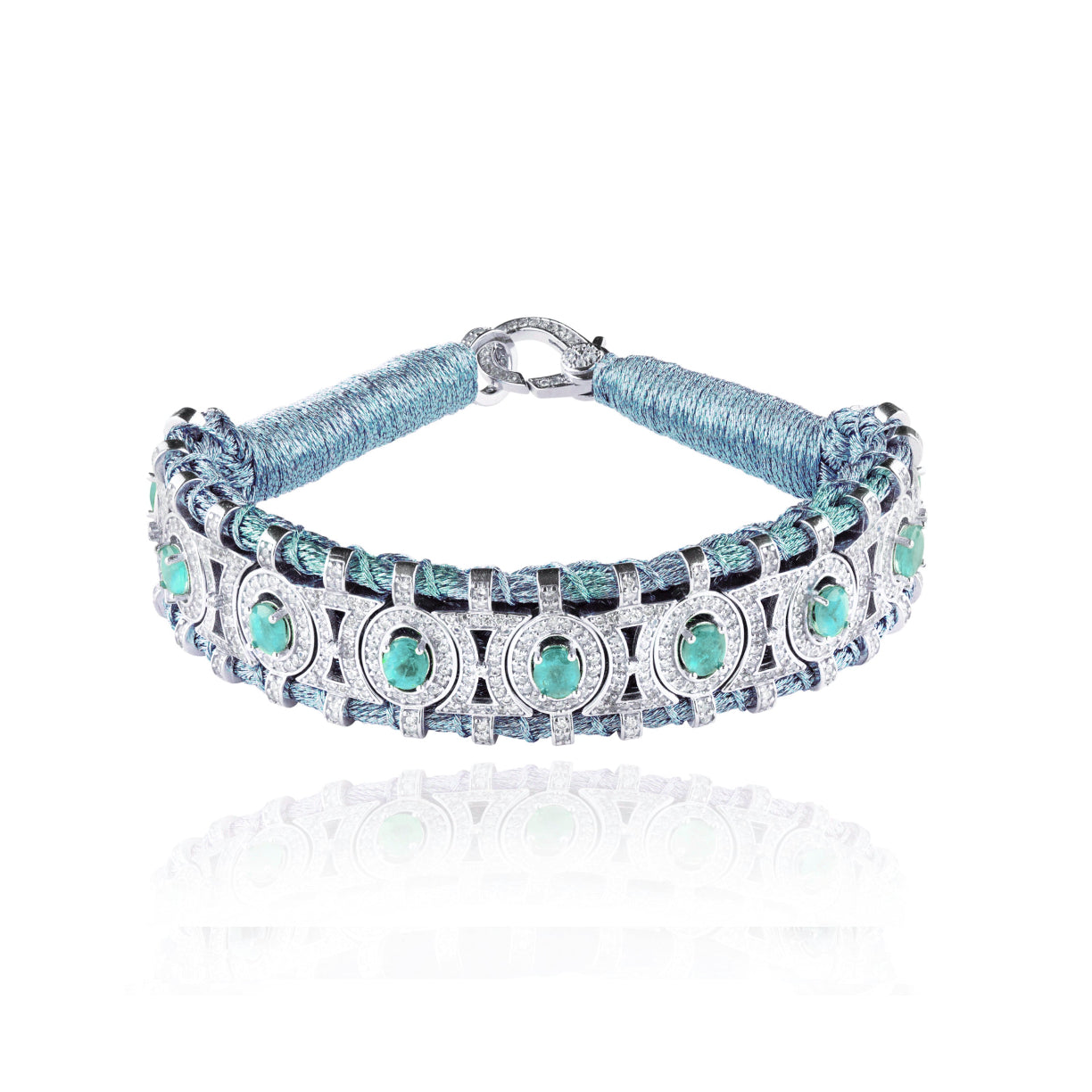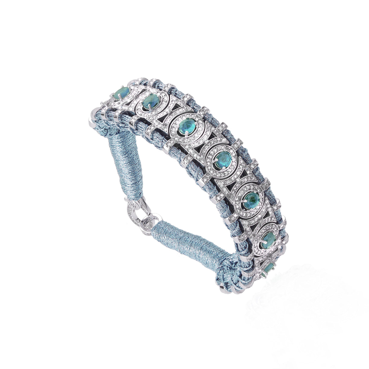 Ce bracelet en fil couleur bleu Sky sera votre porte-bonheur bohème de l’été. Il est intégralement décoré d’argent formant un motif ovale serti de plus de 300 diamants. Chaque petit ovale est magnifiquement décoré d’une topaze centrale. Il sera pour toujours, votre friendship bracelet au style précieux et ne quittera plus votre poignet.
