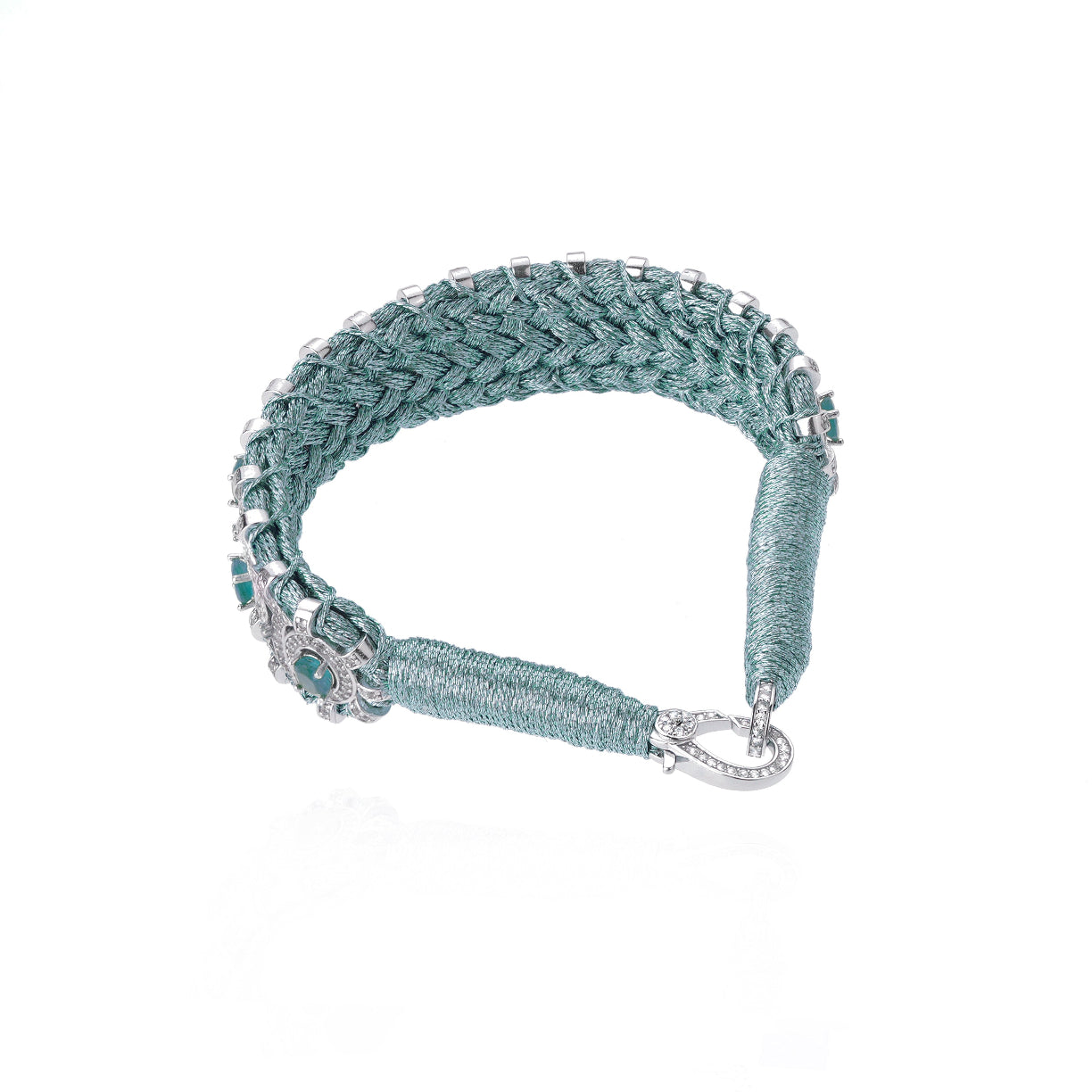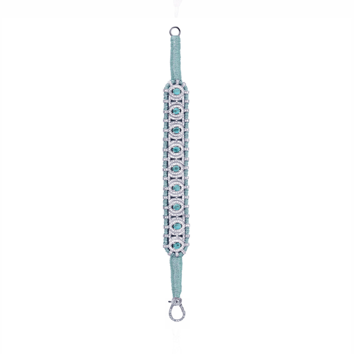 Bracelet en fil de coton tressé de couleur bleu Sky, décoré d’un motif en argent 925 et serti d’une multitude de diamants. Il est décoré de splendides topazes véritables.