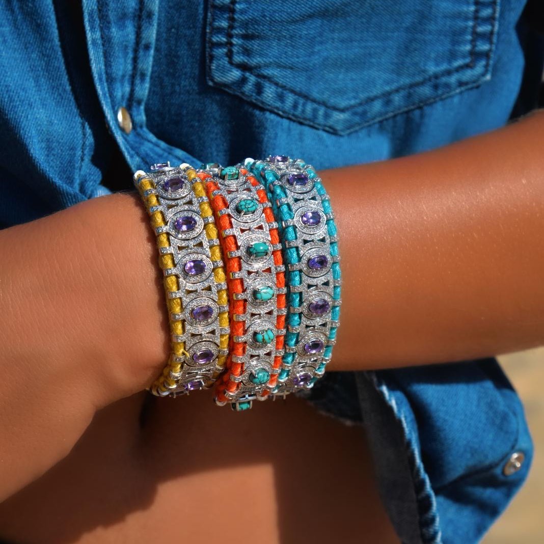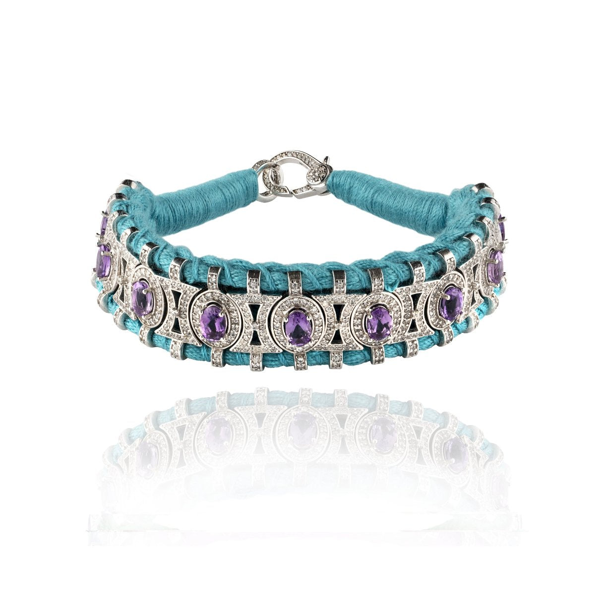 Ce bracelet en fil couleur turquoise sera votre porte-bonheur bohème de l’été. Il est intégralement décoré d’argent formant un motif ovale serti de plus de 300 diamants. Chaque petit ovale est magnifiquement décoré d’une améthystes centrale. Il sera pour toujours, votre friendship bracelet au style précieux et ne quittera plus votre poignet.
