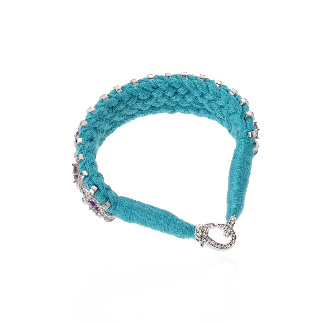 Bracelet en fil de coton tressé de couleur turquoise, décoré d’un motif en argent 925 et serti d’une multitude de diamants. Il est décoré de splendides améthystes véritables.