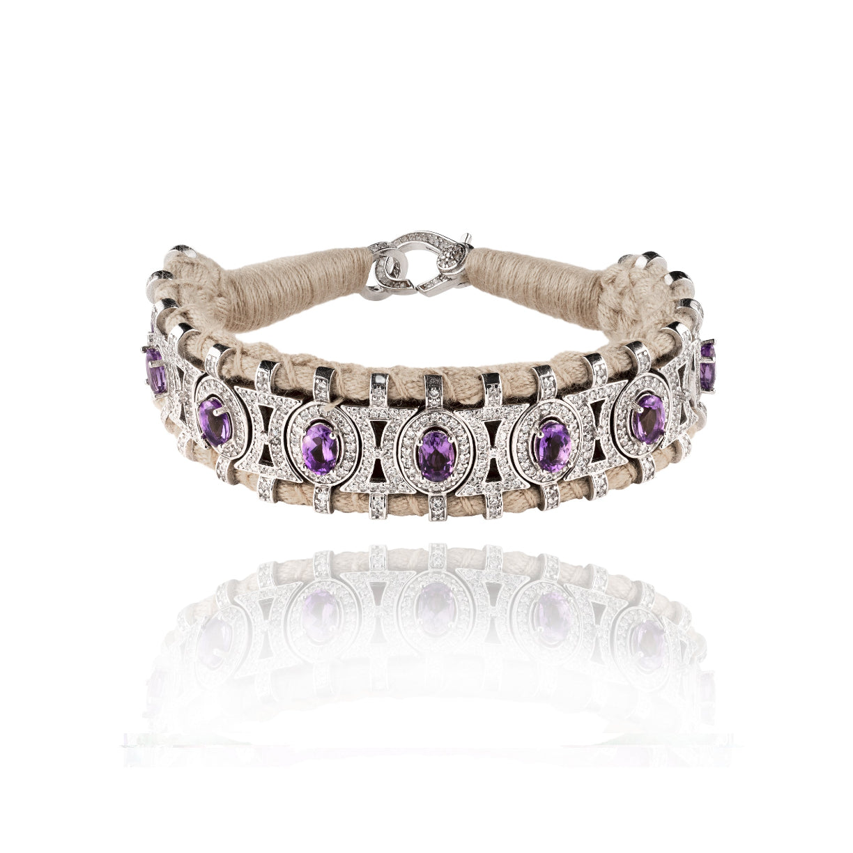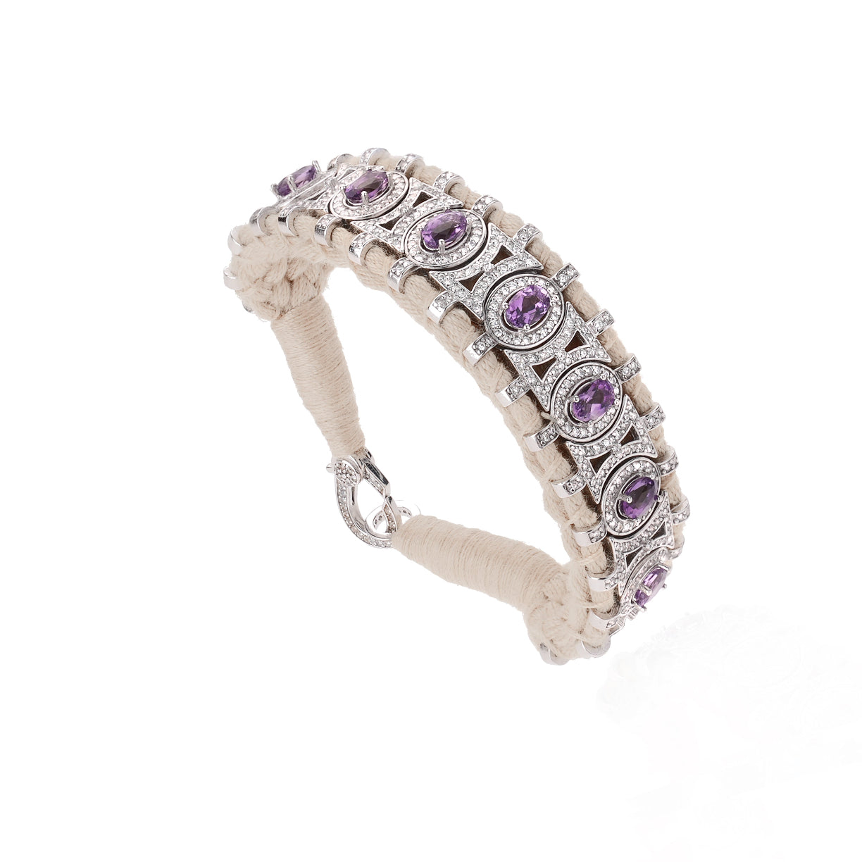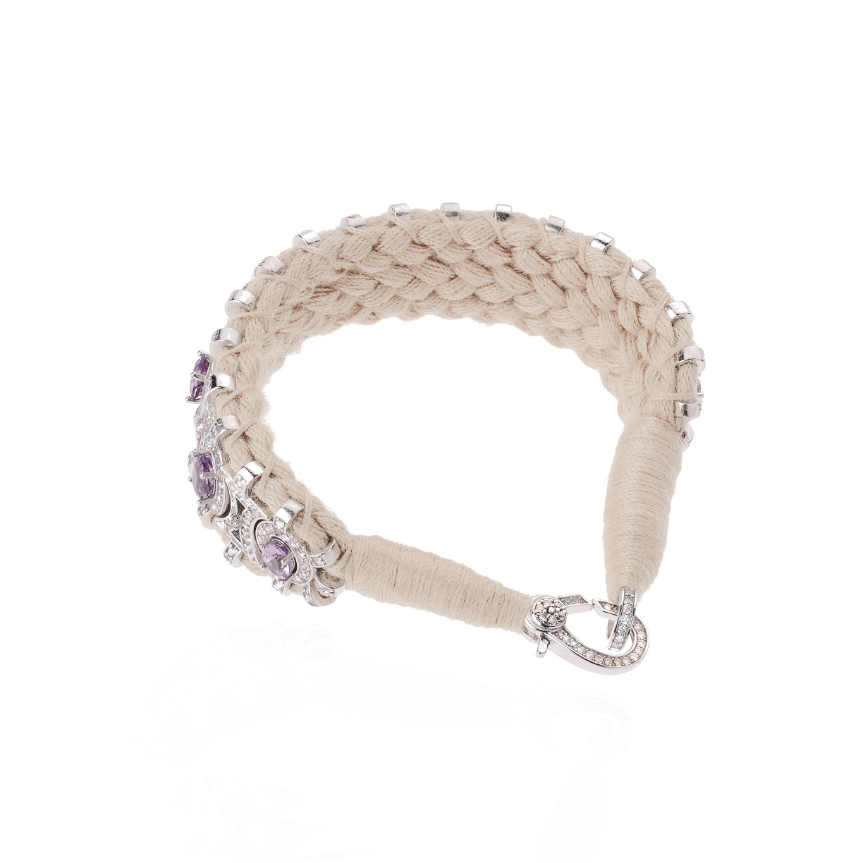 Bracelet en fil de coton tressé de couleur blanc cassé, décoré d’un motif en argent 925 et serti d’une multitude de diamants. Il est décoré de splendides amethystes.