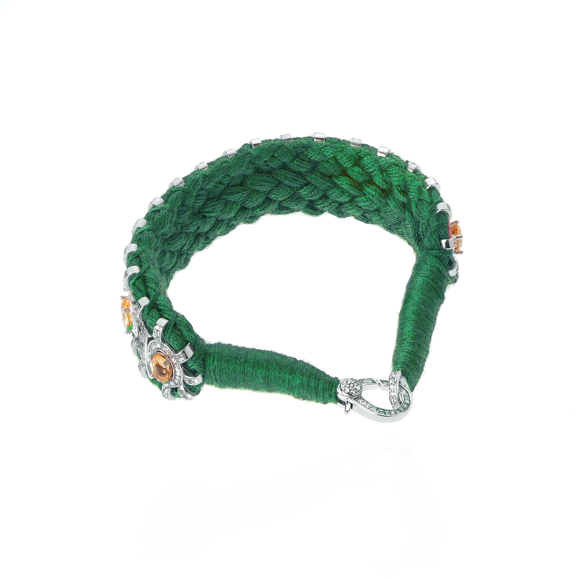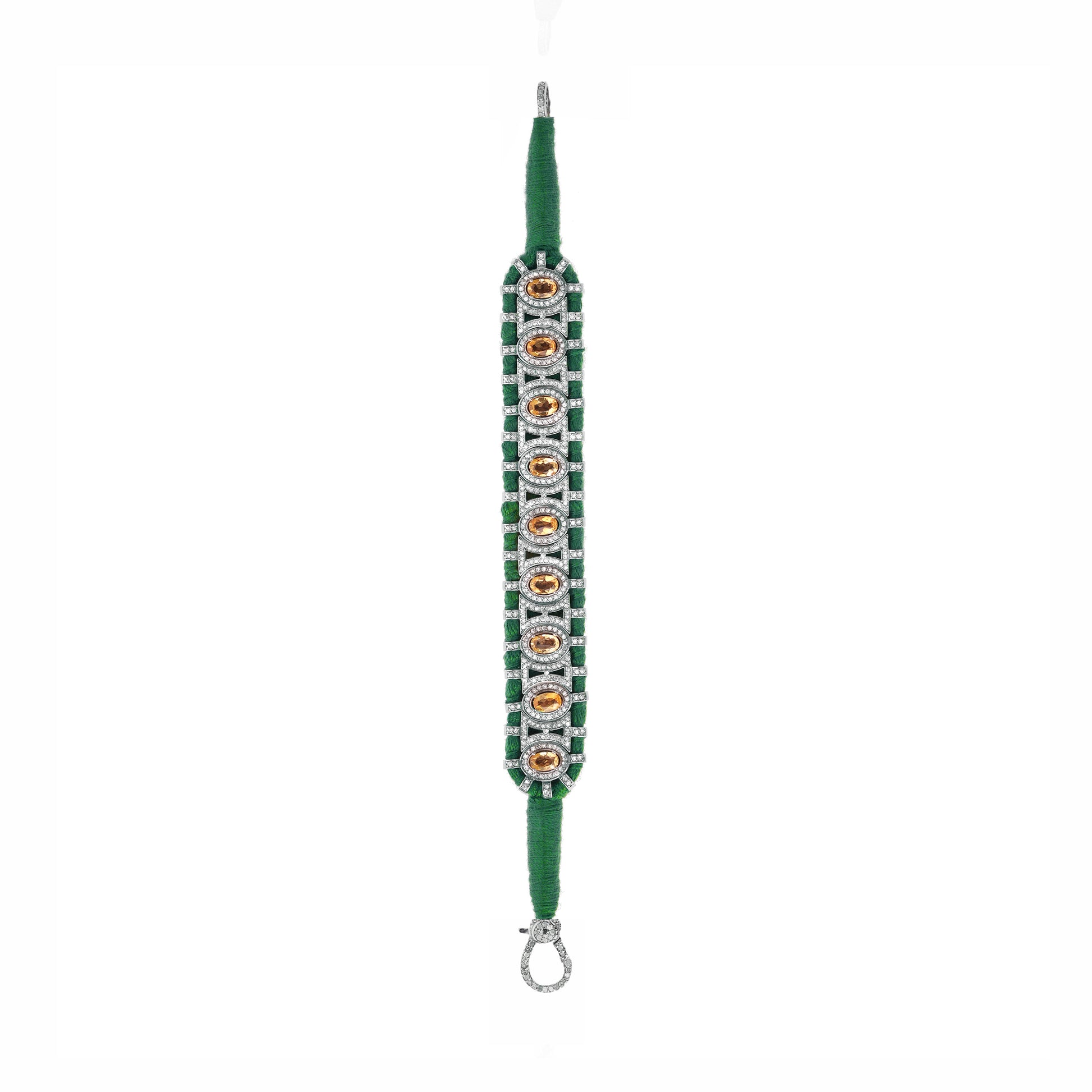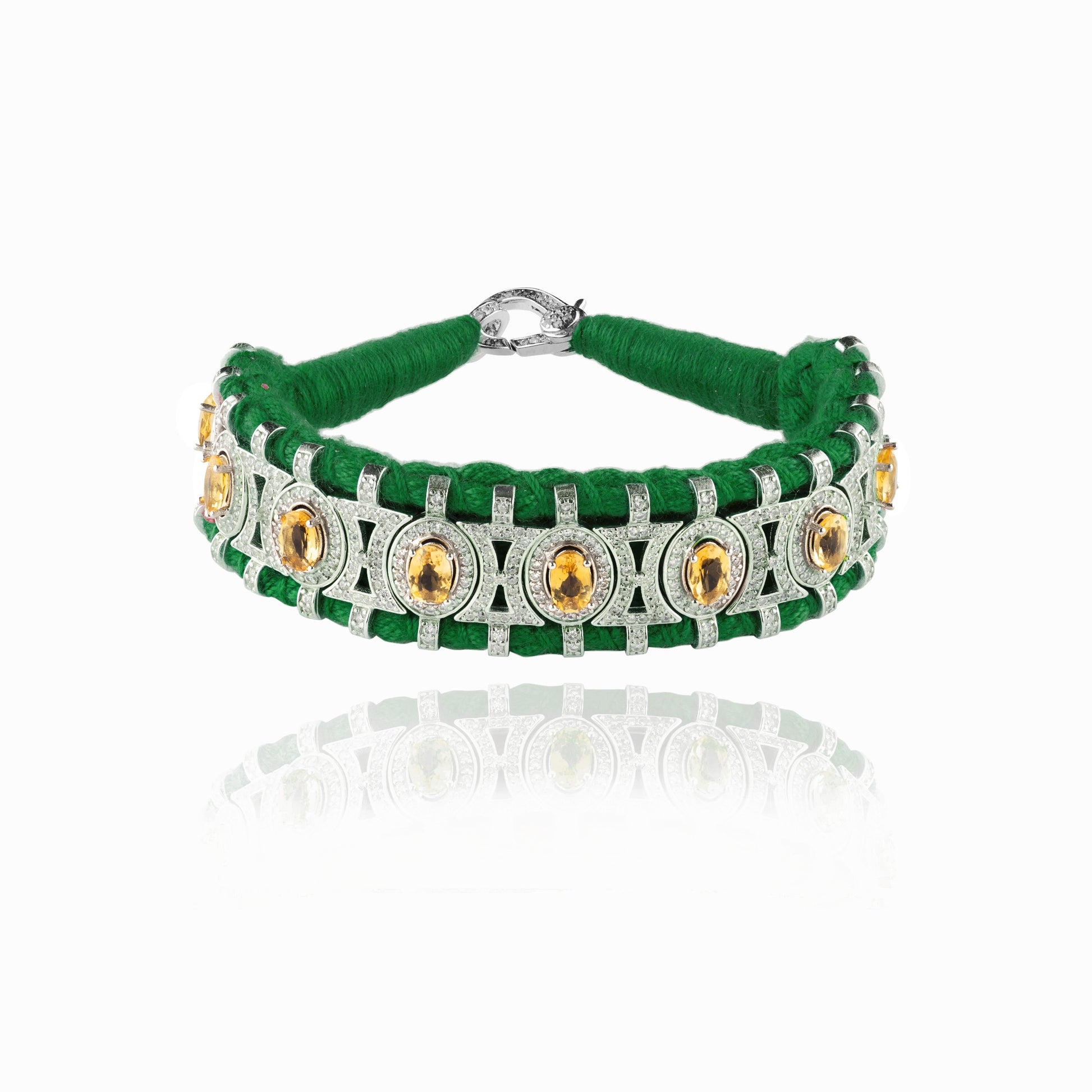 Bracelet en fil de coton tressé de couleur vert, décoré d’un motif en argent 925 et serti d’une multitude de diamants. Il est décoré de splendides citrines véritables.