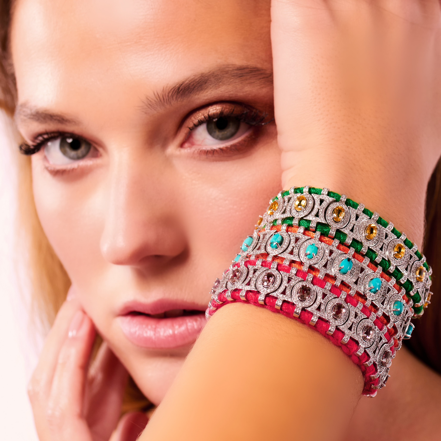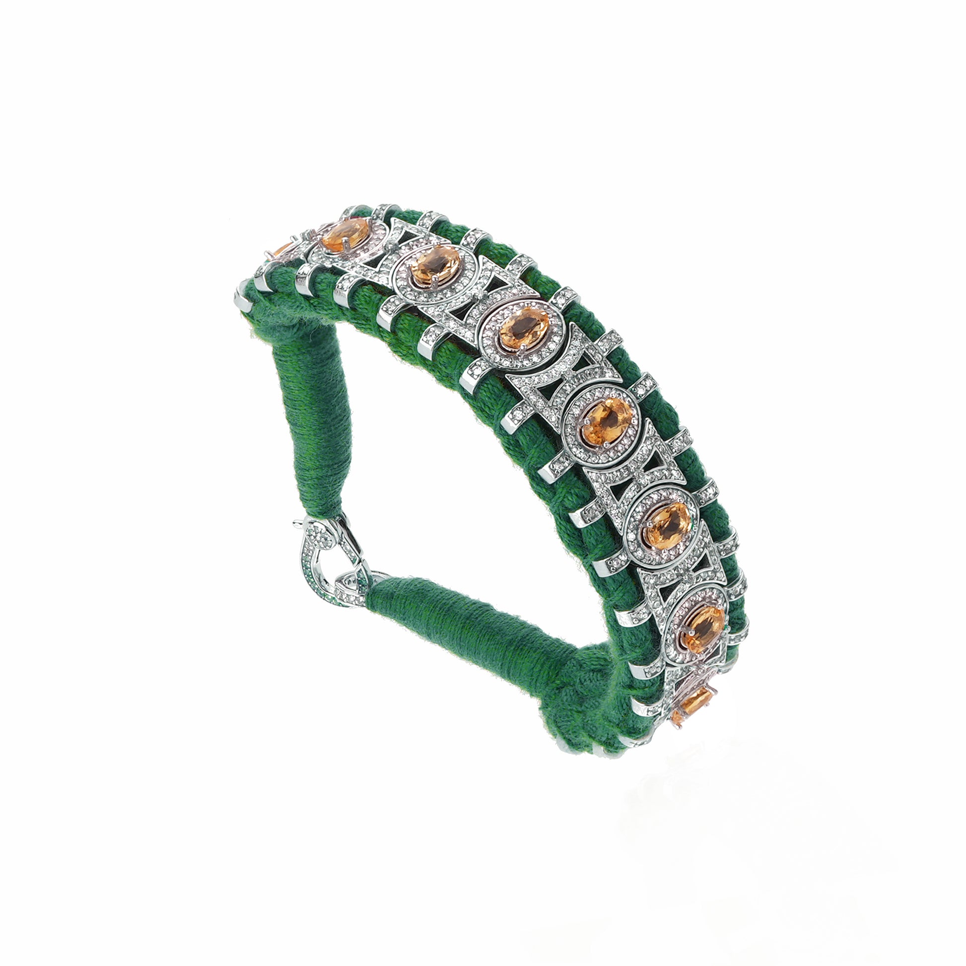 Ce bracelet en fil couleur vert sera votre porte-bonheur bohème de l’été. Il est intégralement décoré d’argent formant un motif ovale serti de plus de 300 diamants. Chaque petit ovale est magnifiquement décoré d’une citrine centrale. Il sera pour toujours, votre friendship bracelet au style précieux et ne quittera plus votre poignet.
