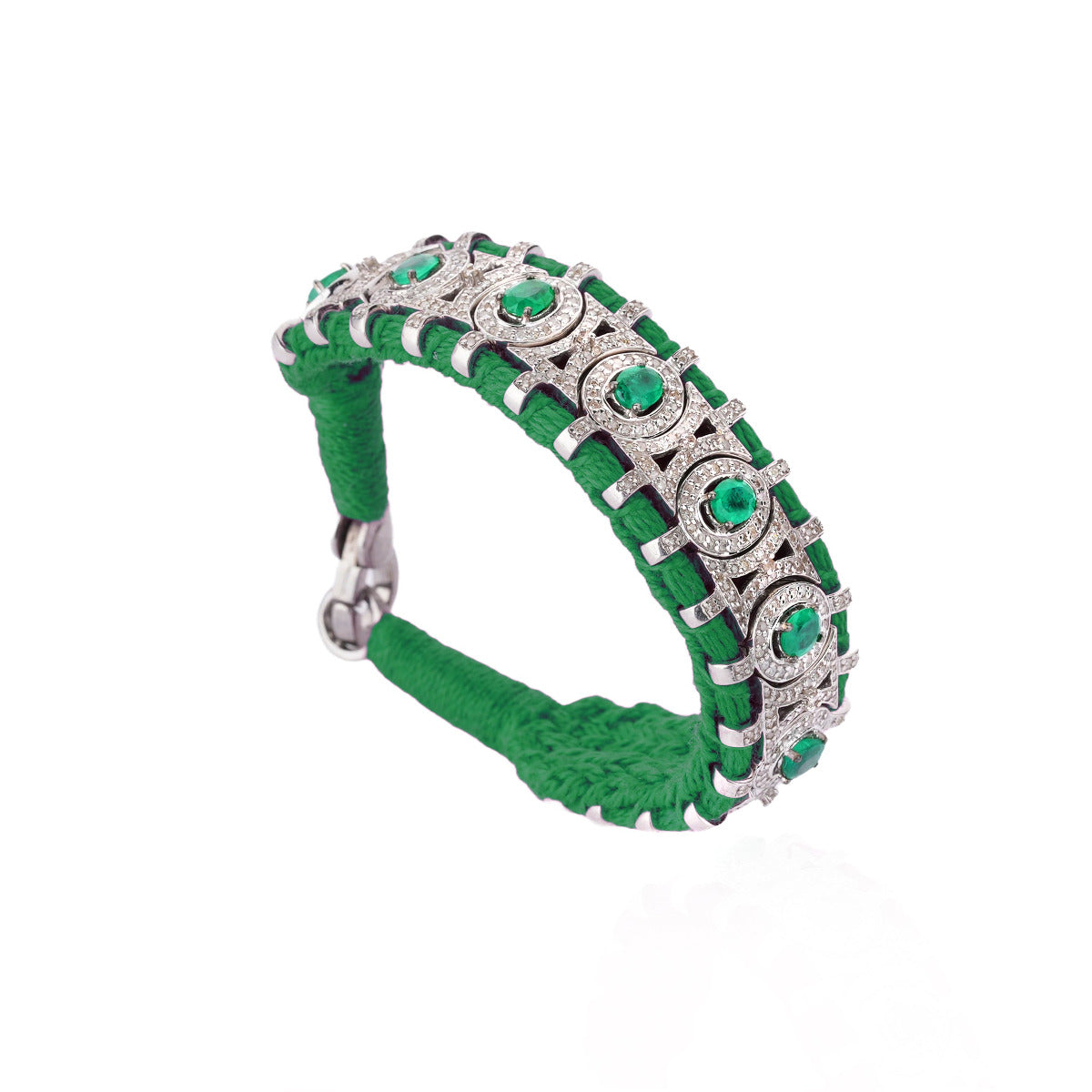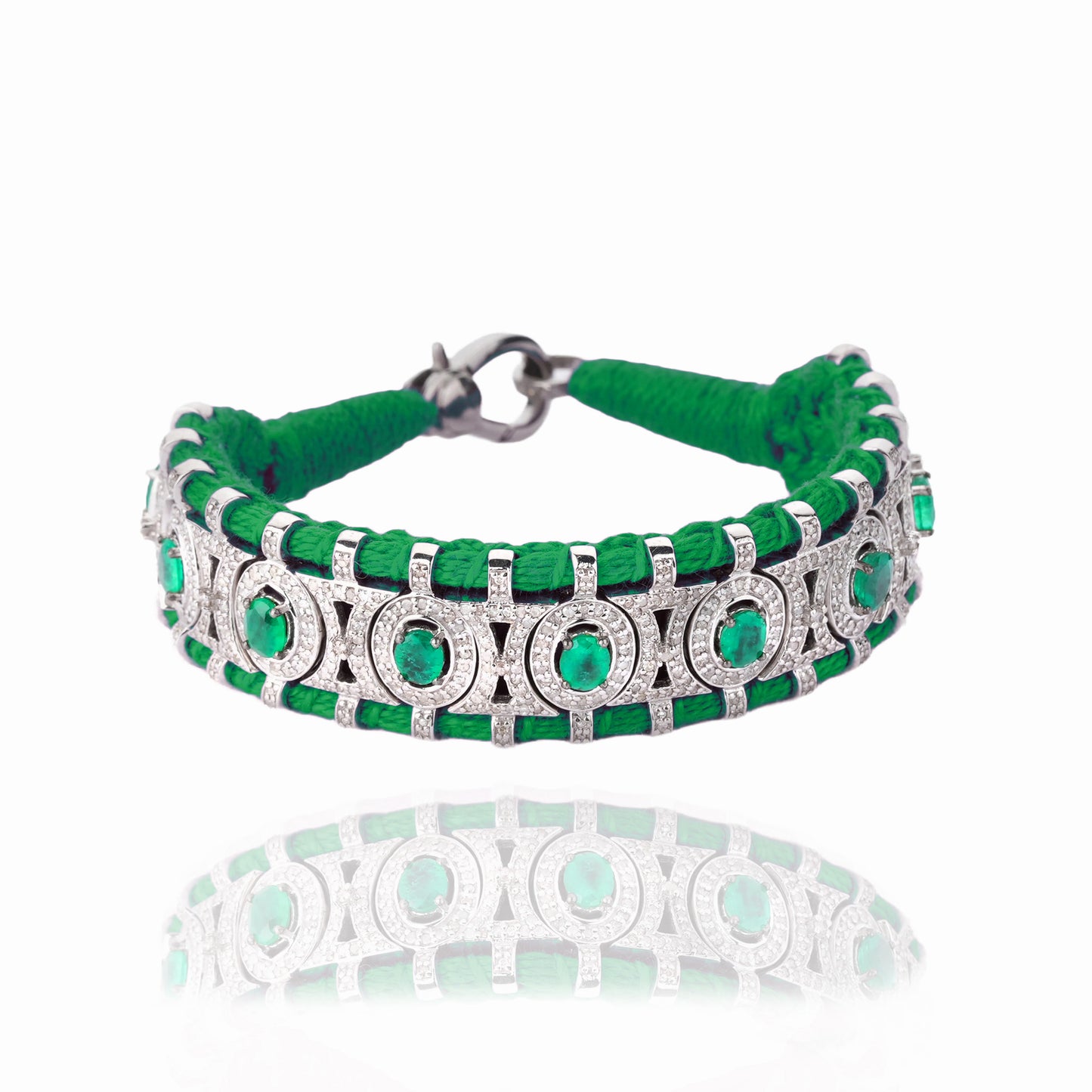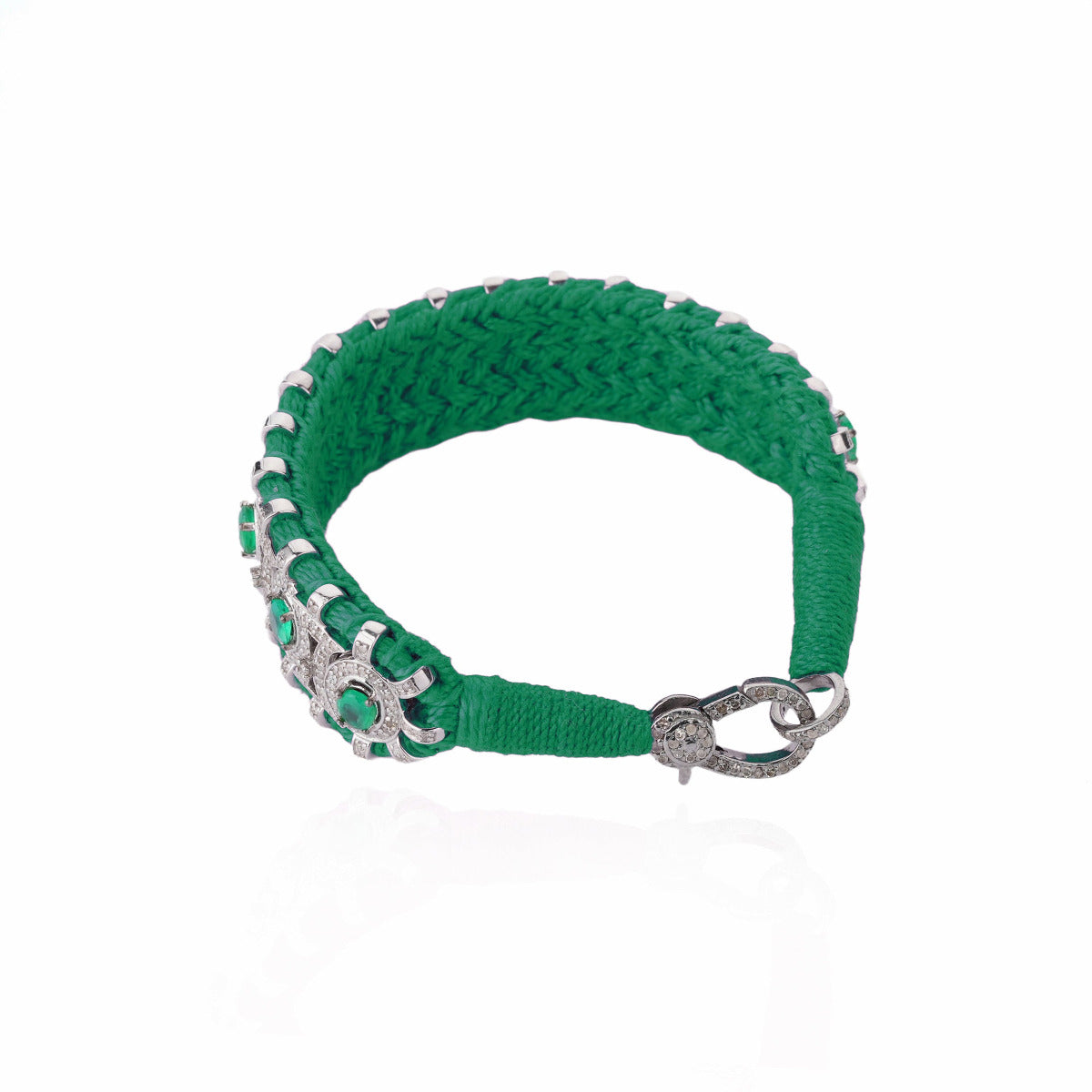 Bracelet en fil de coton tressé de couleur vert, décoré d’un motif en argent 925 et serti d’une multitude de diamants. Il est décoré de splendides émeraudes véritables.