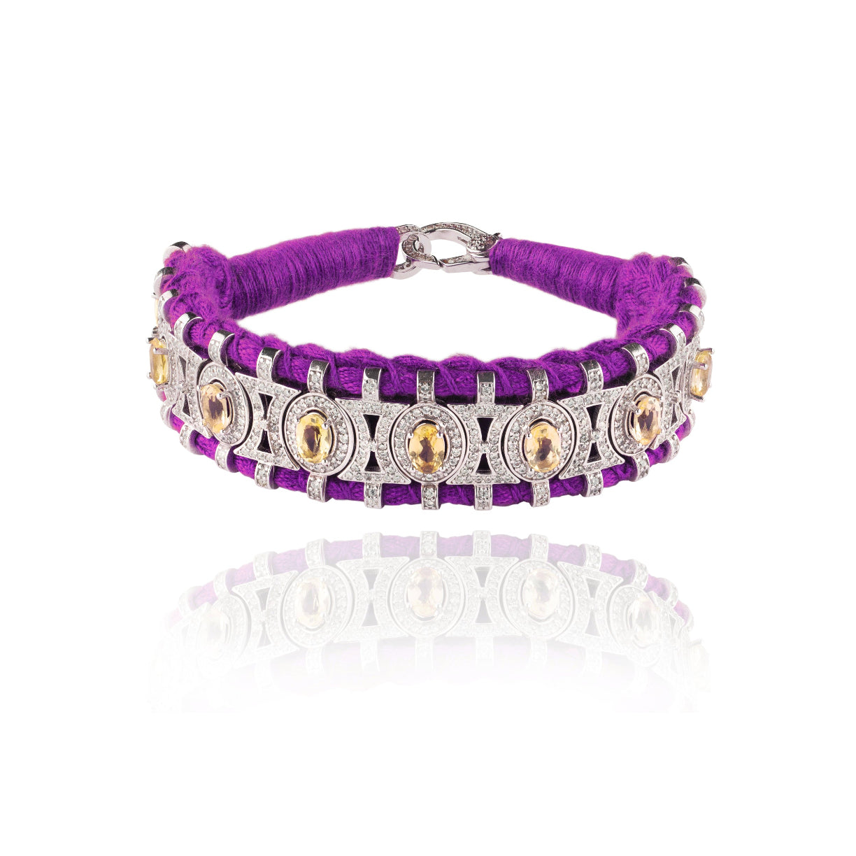 Bracelet en fil de coton tressé de couleur violet, décoré d’un motif en argent 925 et serti d’une multitude de diamants. Il est décoré de splendides citrines véritables.