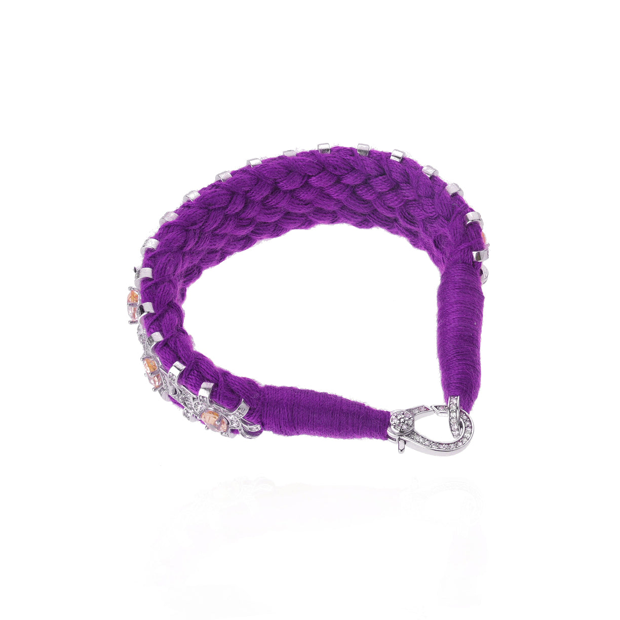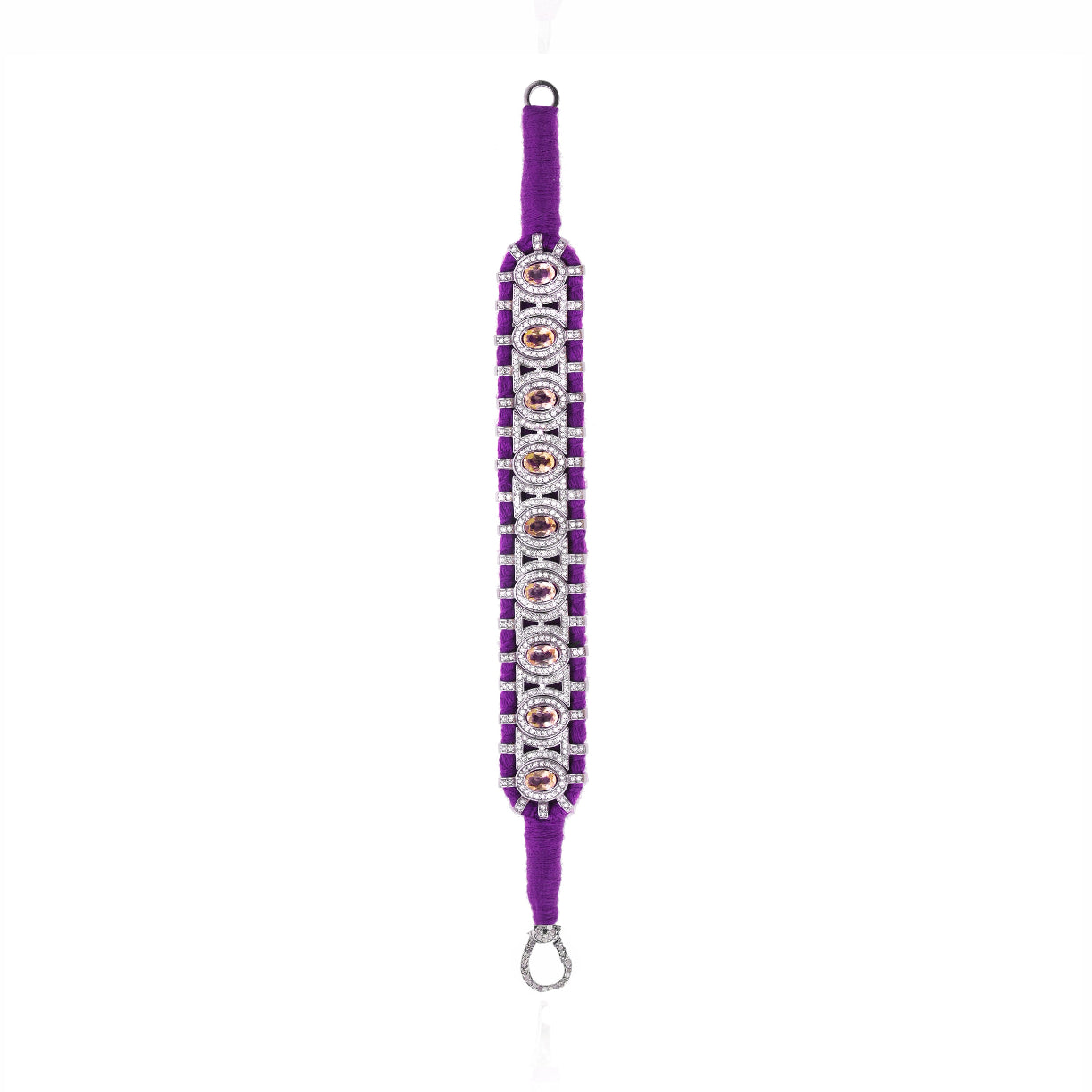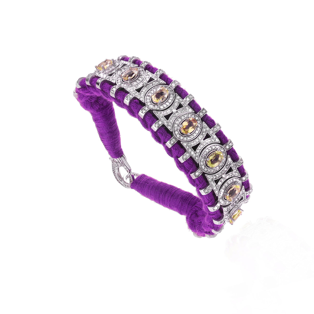 Ce bracelet en fil couleur violet sera votre porte-bonheur bohème de l’été. Il est intégralement décoré d’argent formant un motif ovale serti de plus de 300 diamants. Chaque petit ovale est magnifiquement décoré d’une citrine centrale. Il sera pour toujours, votre friendship bracelet au style précieux et ne quittera plus votre poignet.