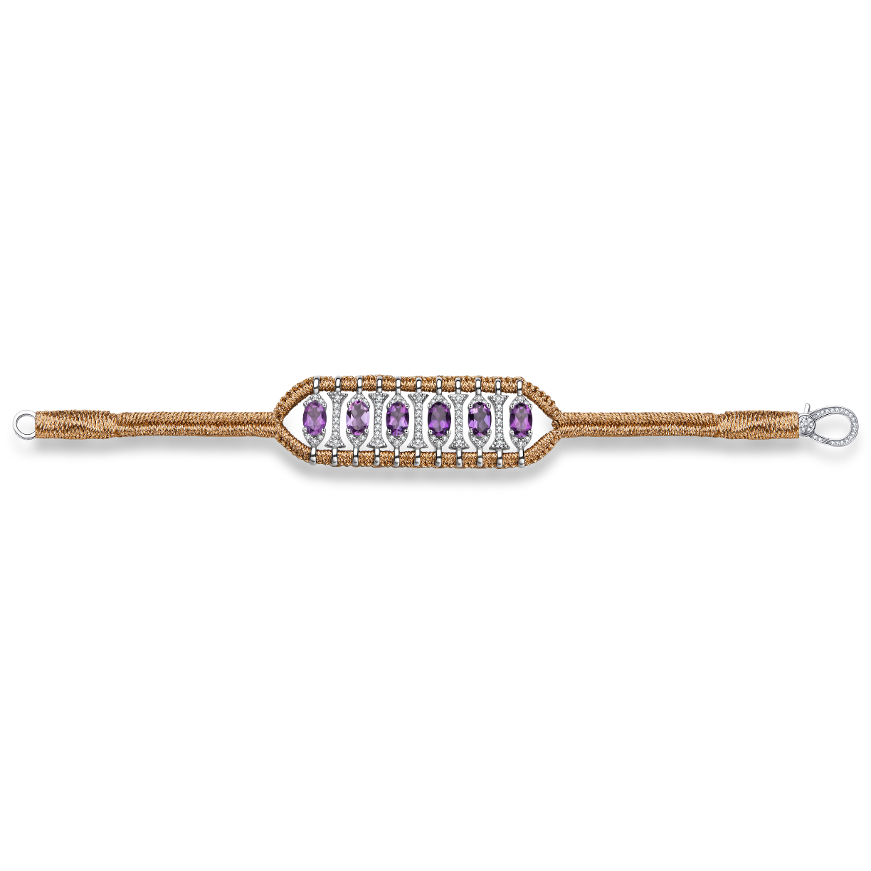Bracelet ajouré en fil de lurex tressé de couleur brass orné d'un motif en argent 925 entièrement pavé de moissanites et rehaussé d'Améthystes.