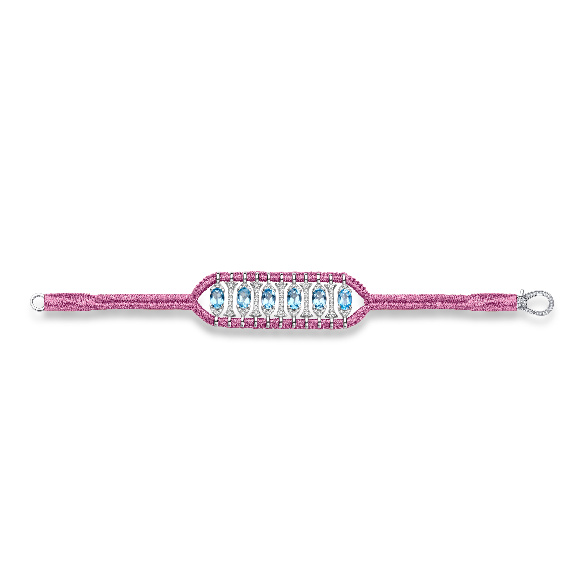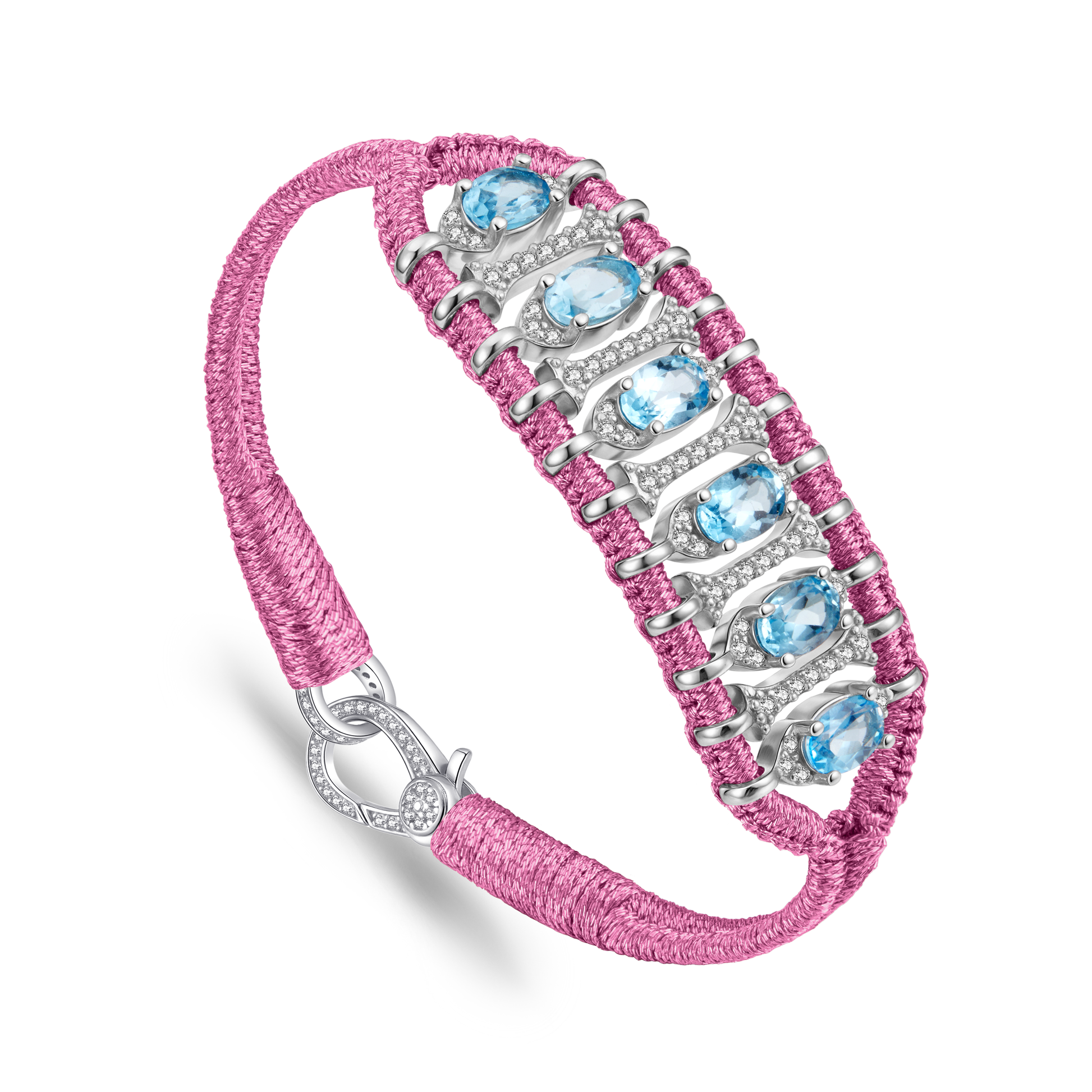 Bracelet ajouré en fil de lurex tressé de couleur candy orné d'un motif en argent 925 entièrement pavé de moissanites et rehaussé de topazes bleu swiss.