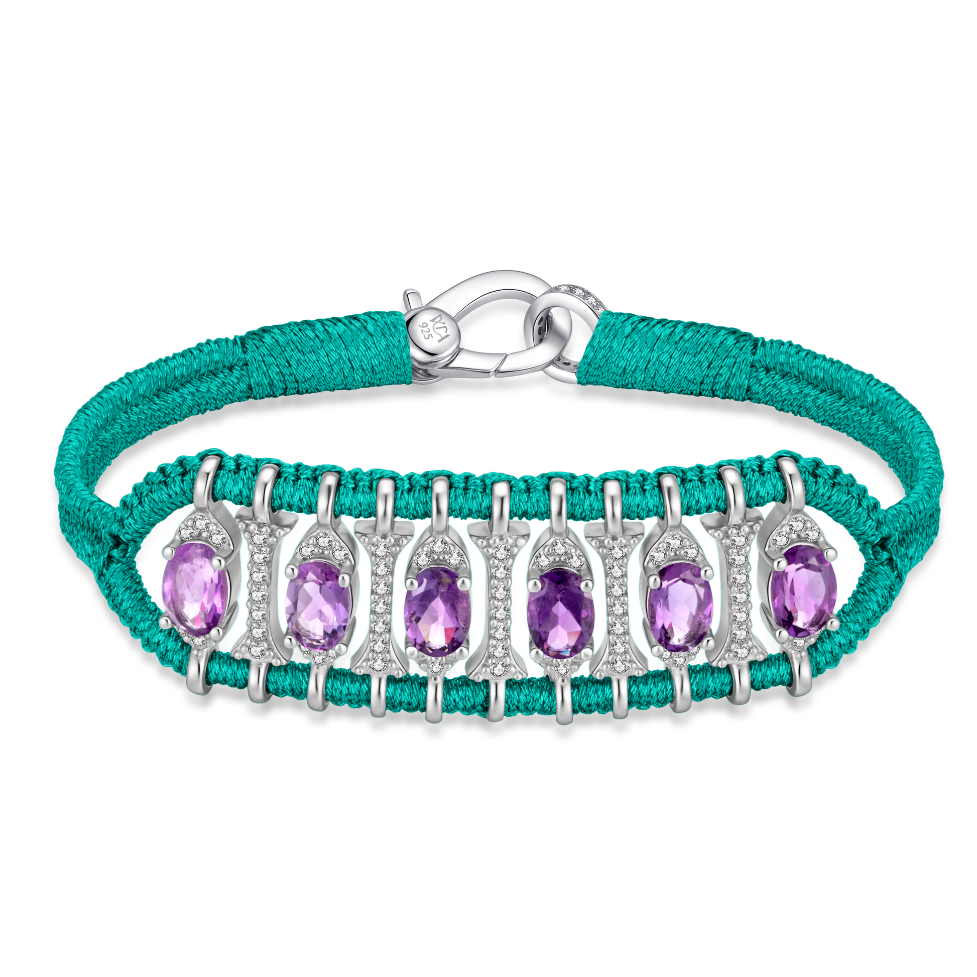 Bracelet en fil de lurex tressé couleur emerald orné d'un motif en argent 925 entièrement pavé de moissanites et rehaussé de Améthystes.