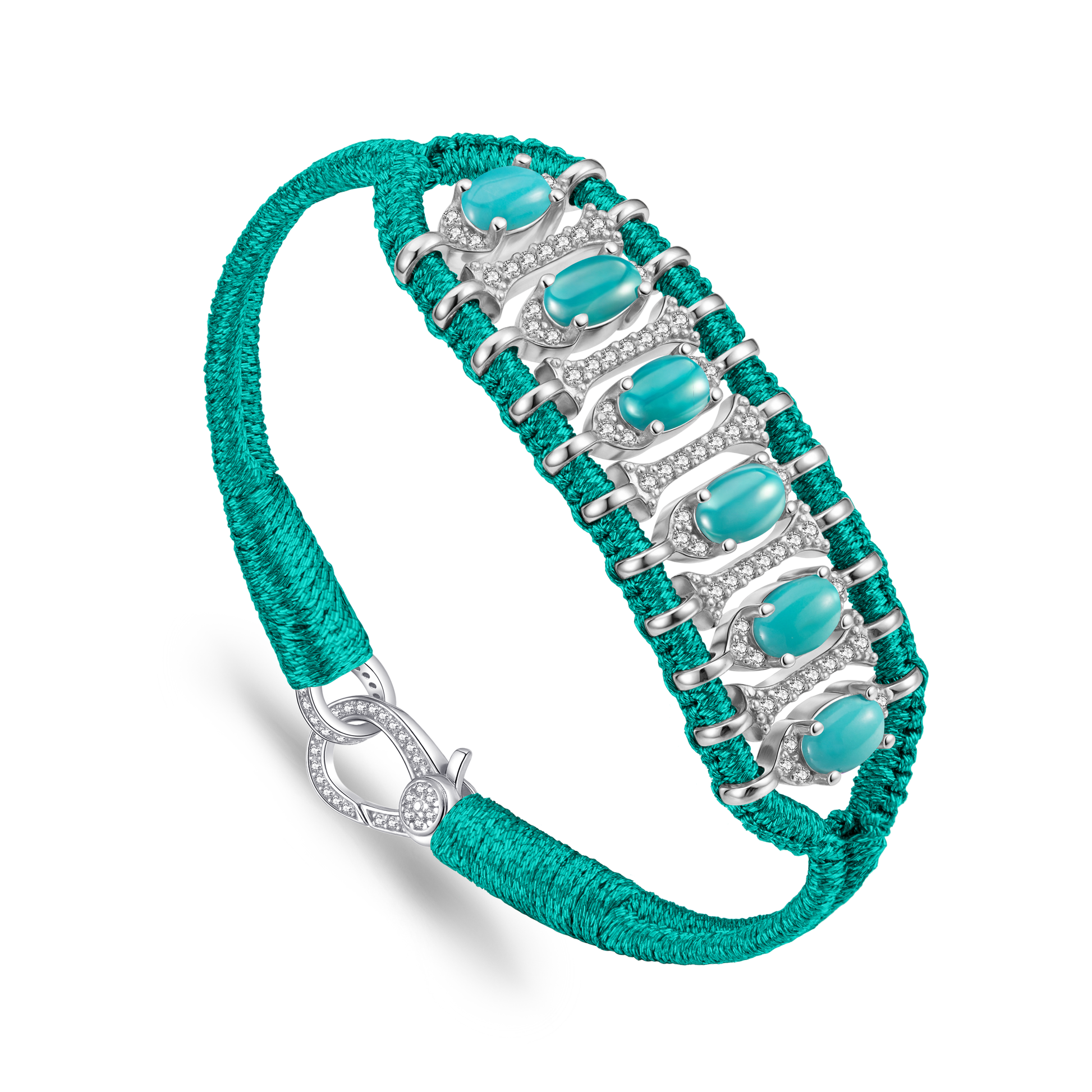 Bracelet ajouré en fil de lurex tressé emeraude orné d'un motif en argent 925 entièrement pavé de moissanites et rehaussé de turquoises.