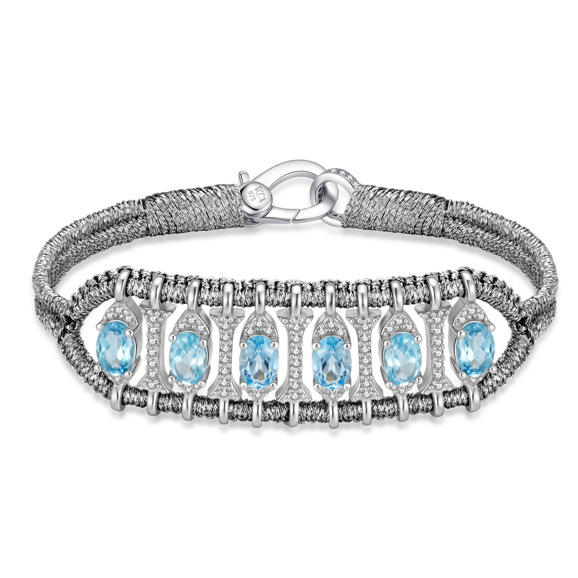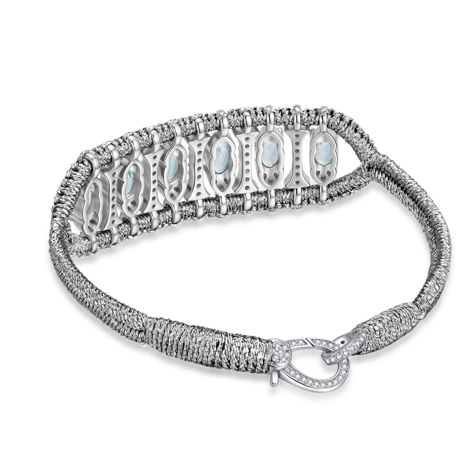 Bracelet ajouré en fil de lurex tressé de couleur gun orné d'un motif en argent 925 entièrement pavé de moissanites et rehaussé de topazes bleu swiss.