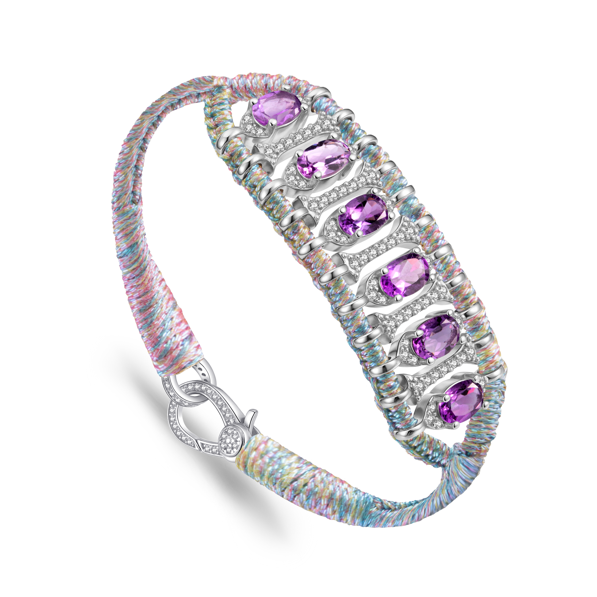 Bracelet ajouré en fil de lurex tressé de couleur mermaid orné d'un motif en argent 925 entièrement pavé de moissanites et rehaussé d'Améthystes.