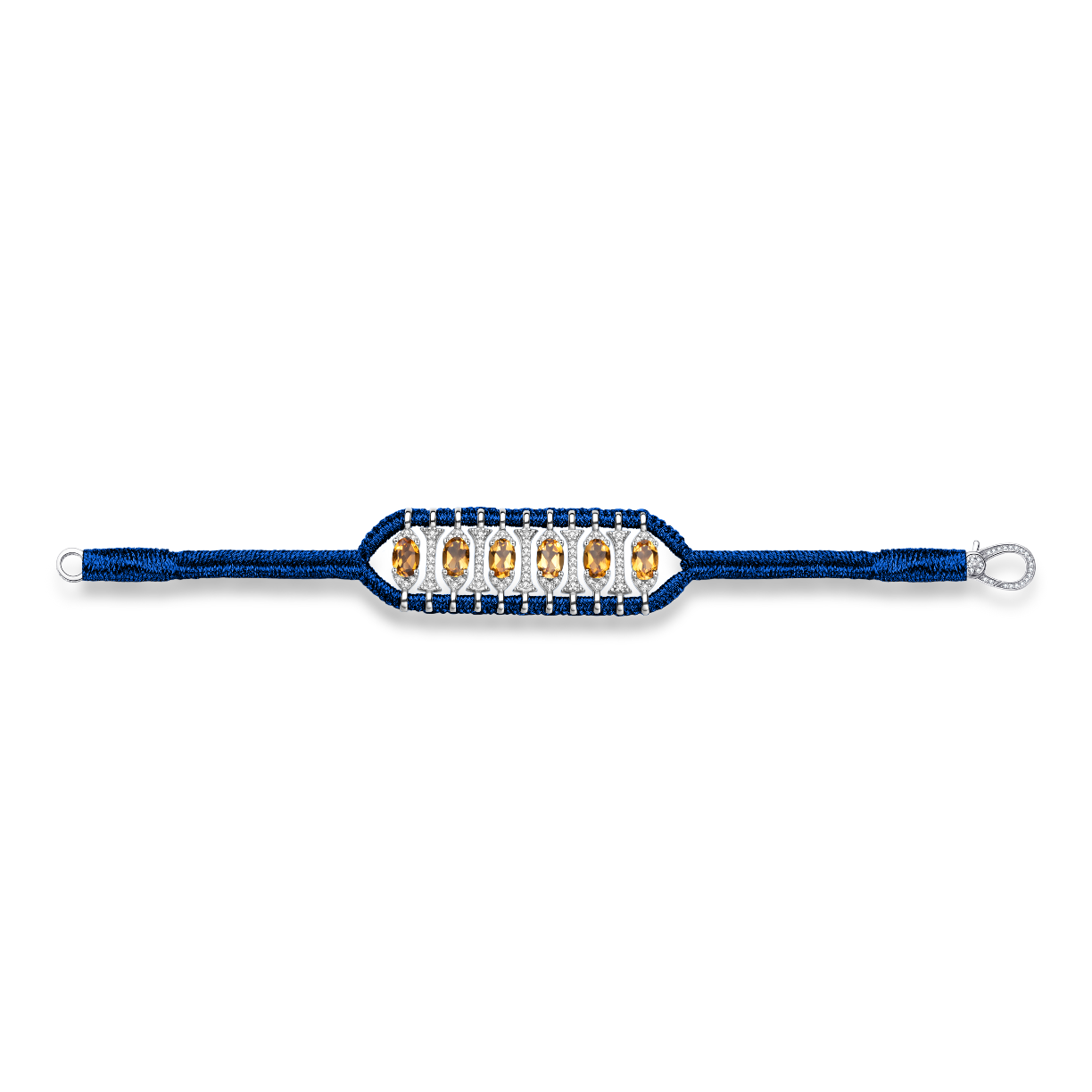 Bracelet en fil de lurex tressé couleur night orné d'un motif en argent 925 entièrement pavé de moissanites et rehaussé de citrines.