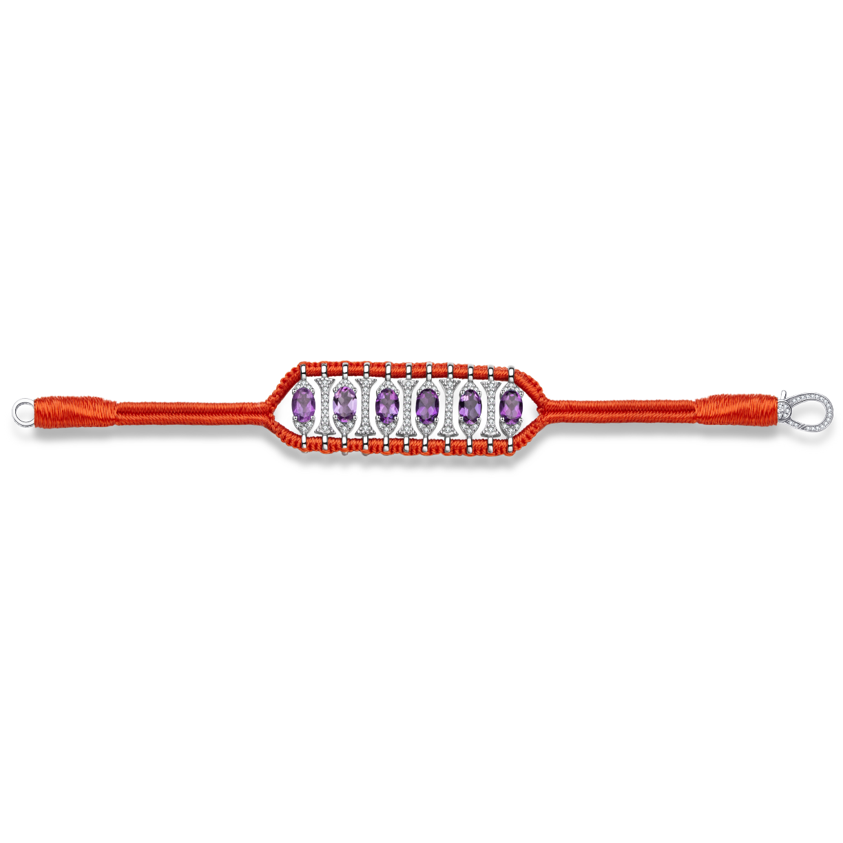 Bracelet ajouré en fil de coton tressé de couleur orange orné d'un motif en argent 925 entièrement pavé de moissanites et rehaussé d'Améthystes.
