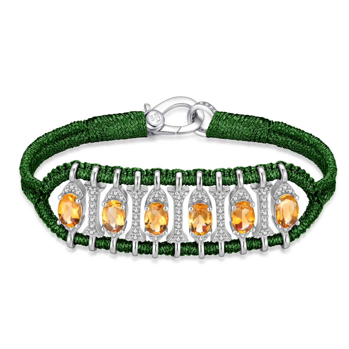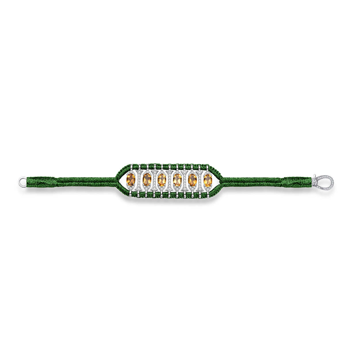Bracelet en fil de lurex tressé couleur pine orné d'un motif en argent 925 entièrement pavé de moissanites et rehaussé de citrines.