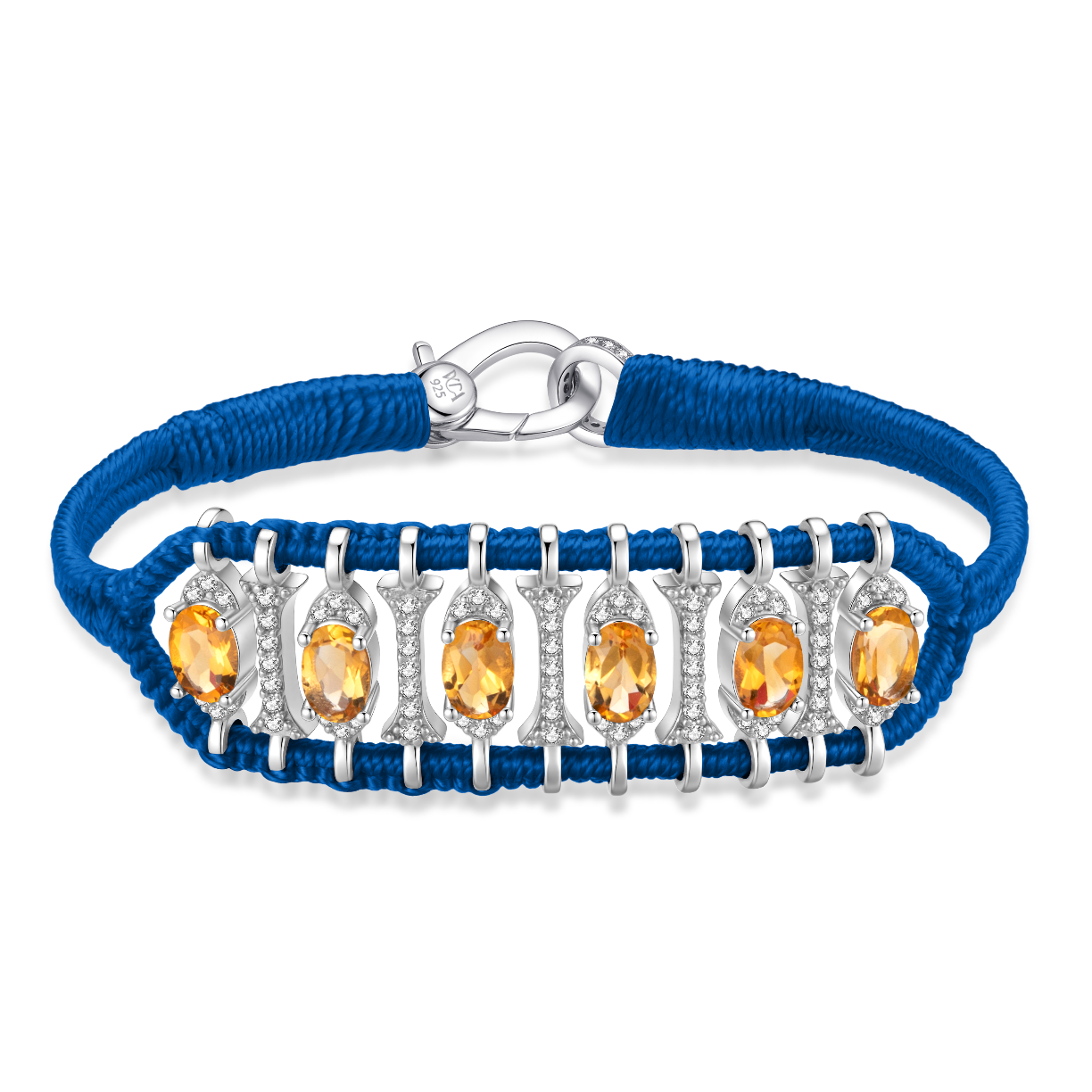 Bracelet en fil de coton tressé couleur Roy orné d'un motif en argent 925 entièrement pavé de moissanites et rehaussé de citrines.