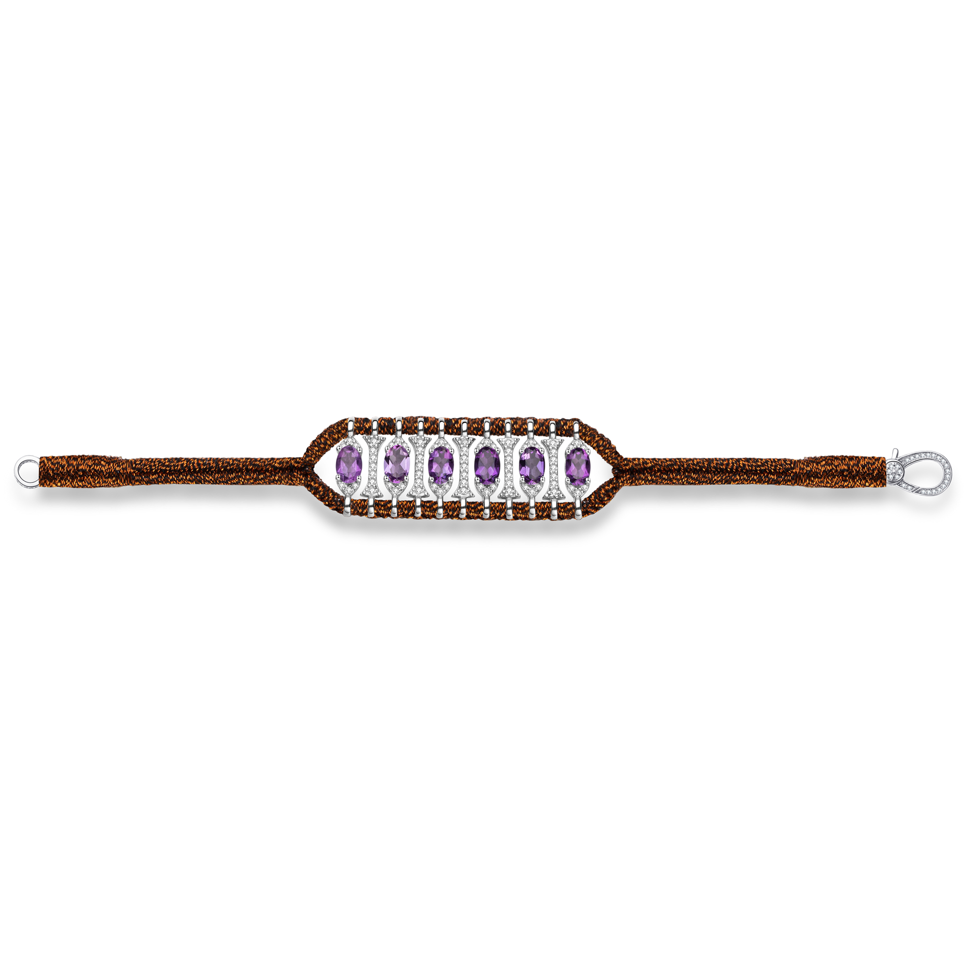 Bracelet en fil de lurex tressé couleur rusty orné d'un motif en argent 925 entièrement pavé de moissanites et rehaussé de Améthystes.