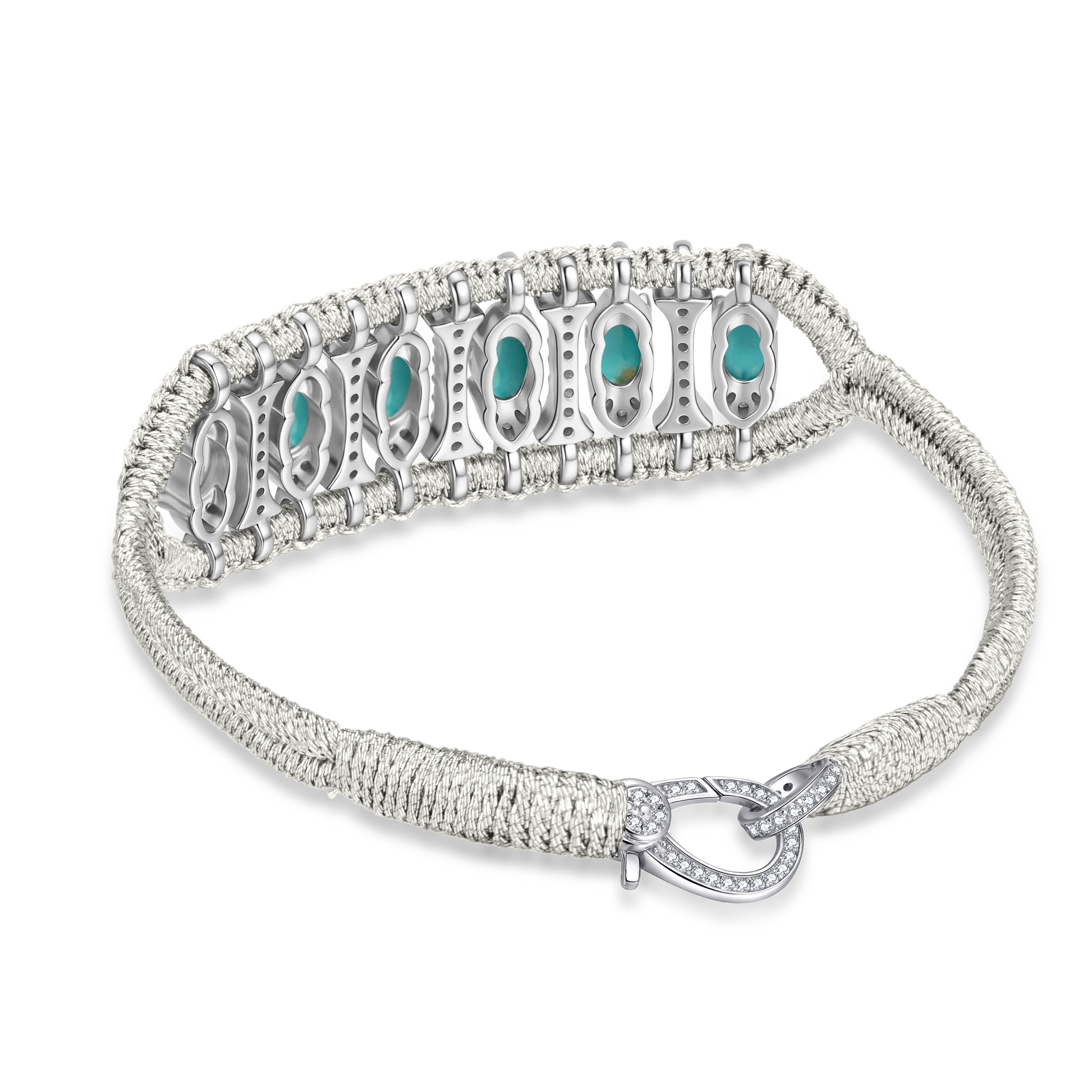 Bracelet ajouré en fil de lurex tressé silver orné d'un motif en argent 925 entièrement pavé de moissanites et rehaussé de turquoises.