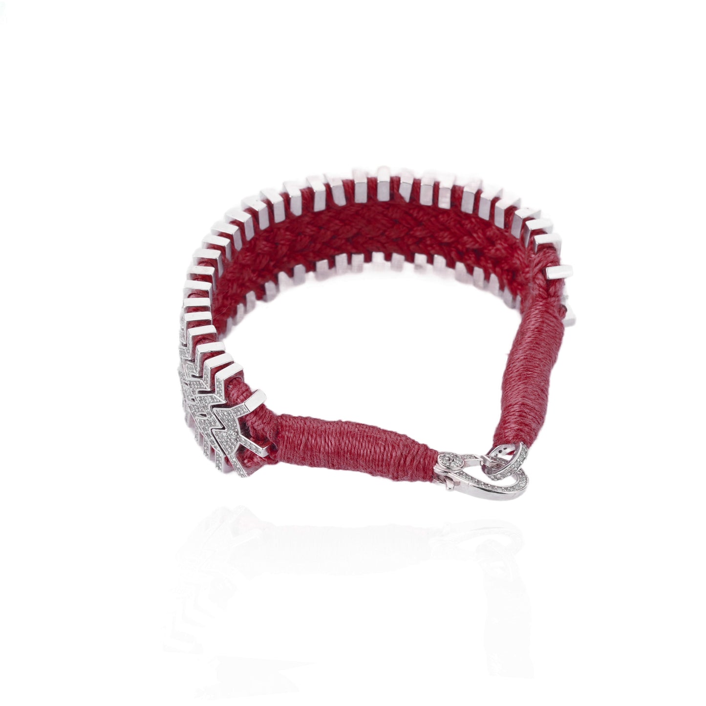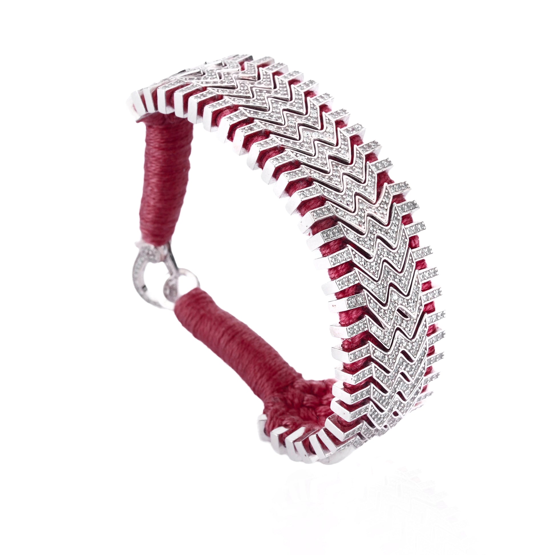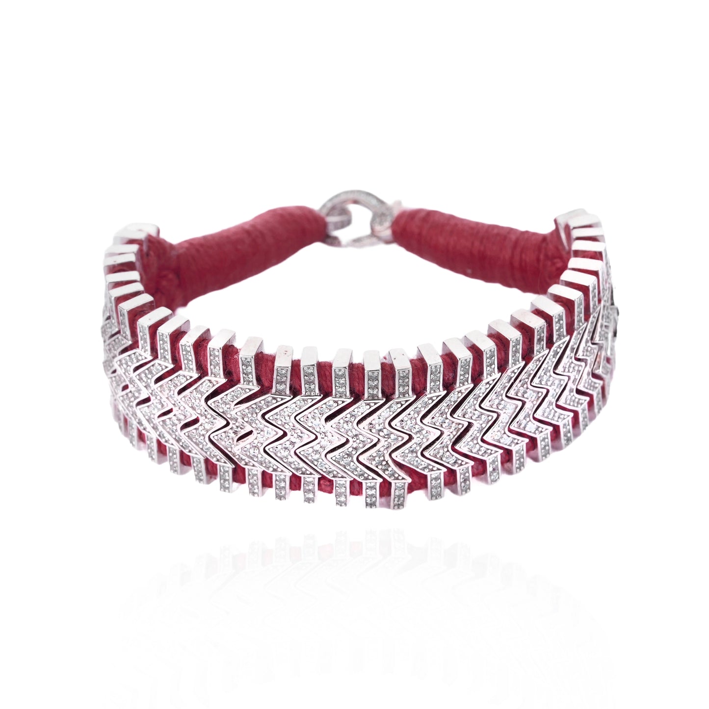 Ce sublime bracelet composé de fil couleur Bamboo et décoré d’un motif argent double chevrons, lui-même serti de plus de 400 diamants.