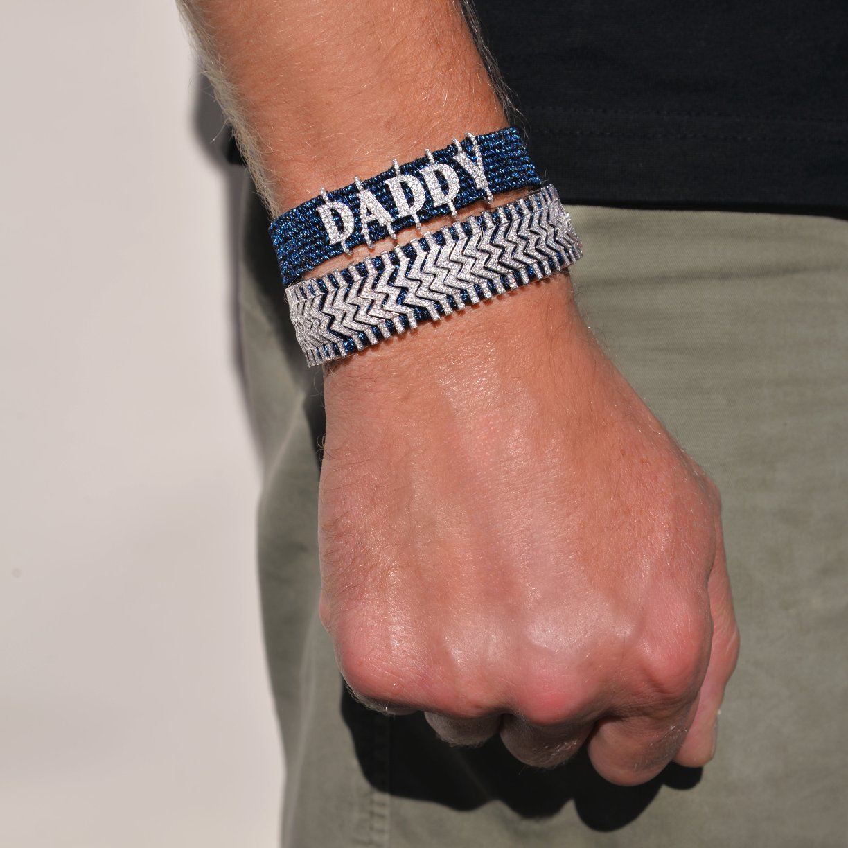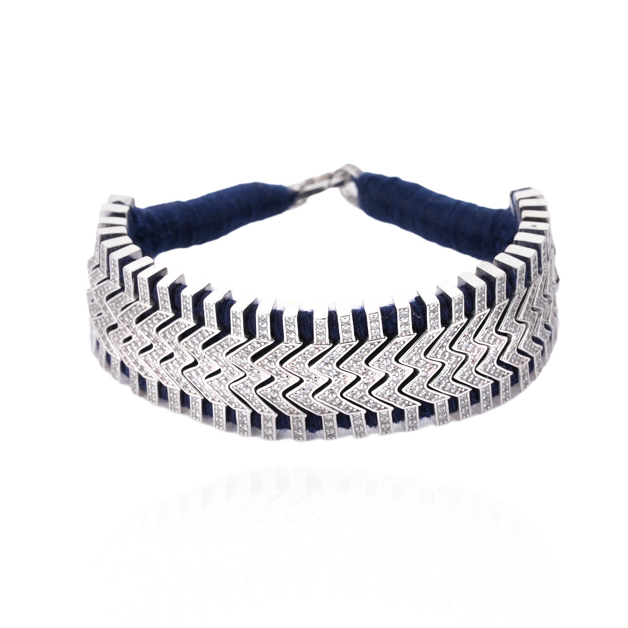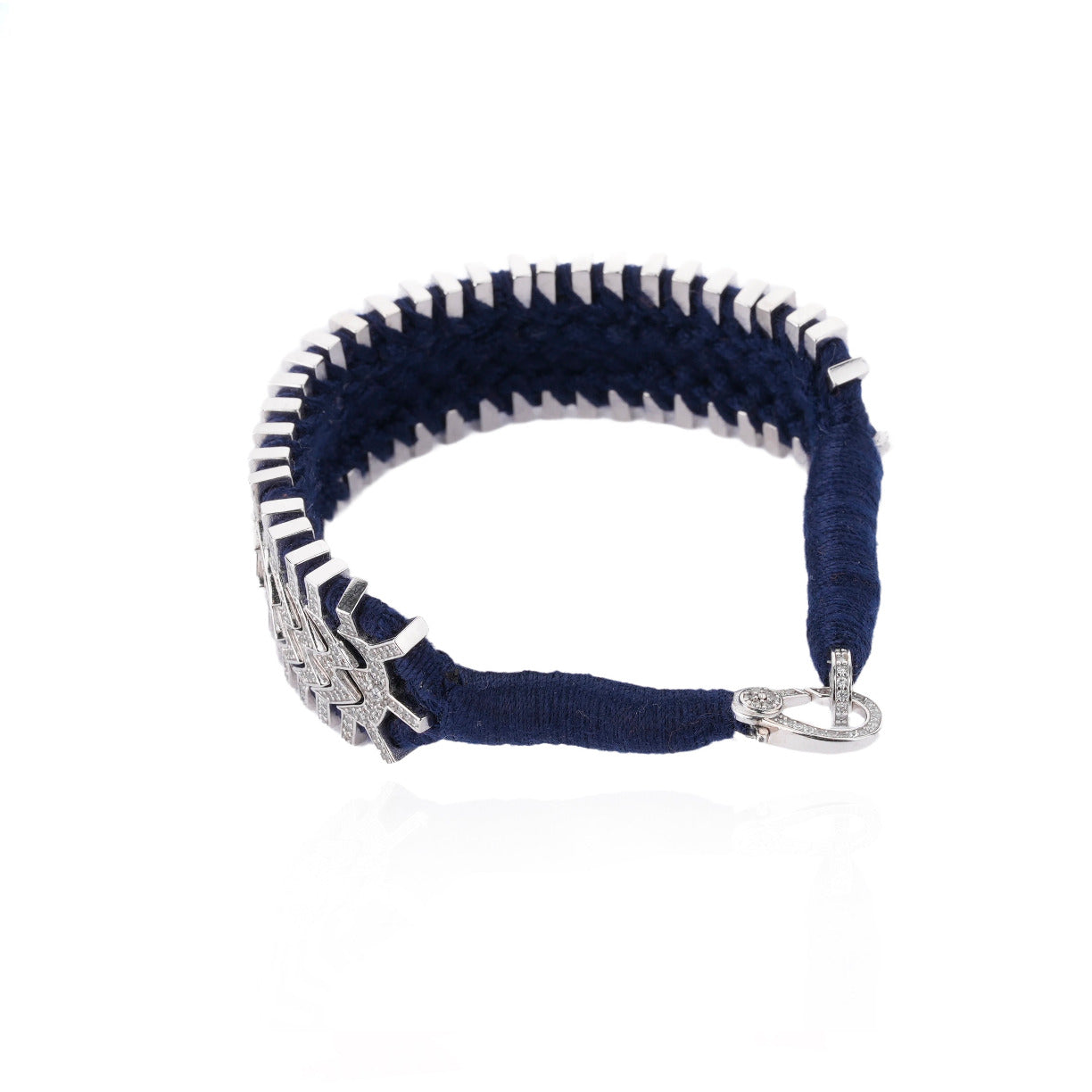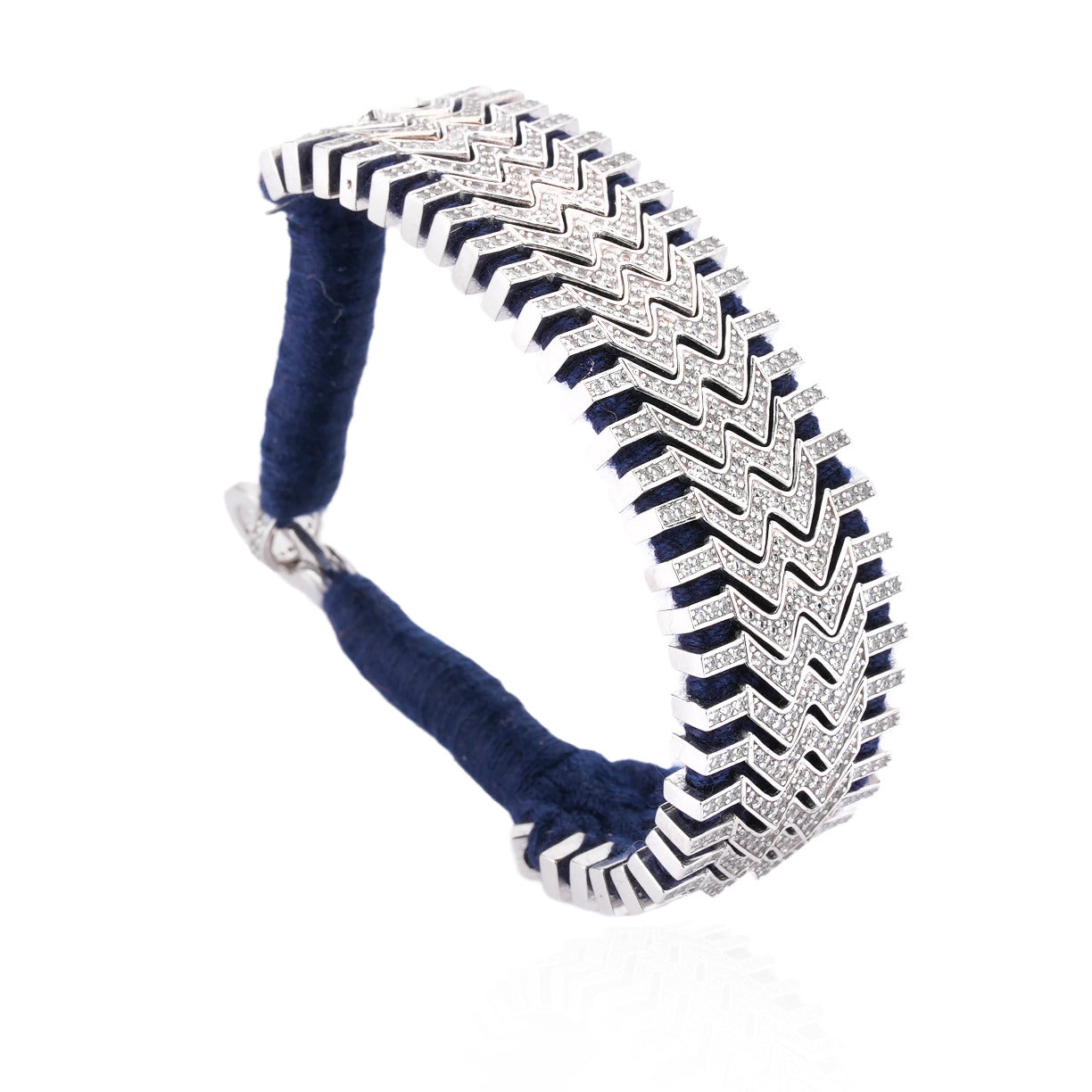 Ce sublime bracelet composé de fil navy et décoré d’un motif argent double chevrons, lui-même serti de plus de 400 diamants.