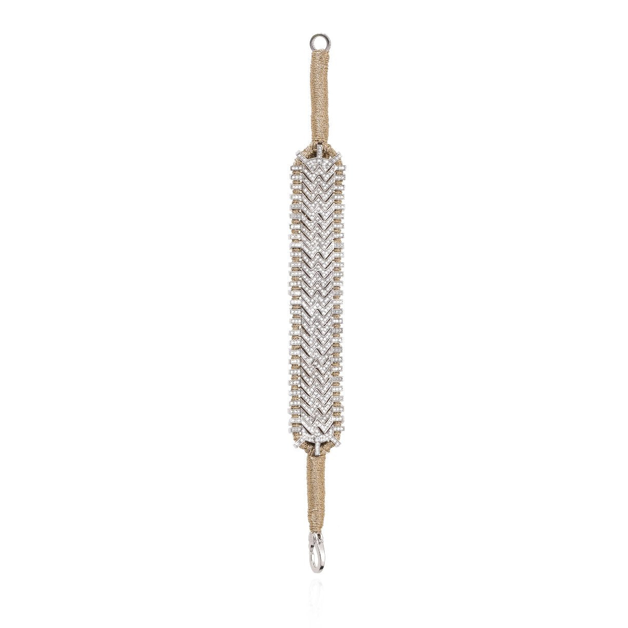 Bracelet en fil de coton tressé de couleur brass décoré d’un motif en argent 925 et serti d’une multitude de diamants.