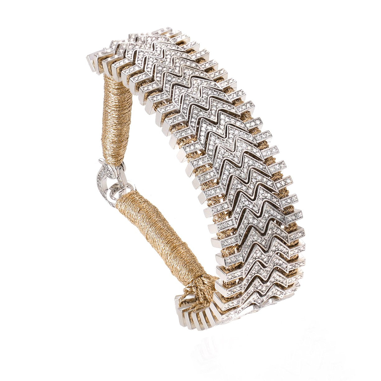 Ce sublime bracelet composé de fil brass et décoré d’un motif argent double chevrons, lui-même serti de plus de 400 diamants.