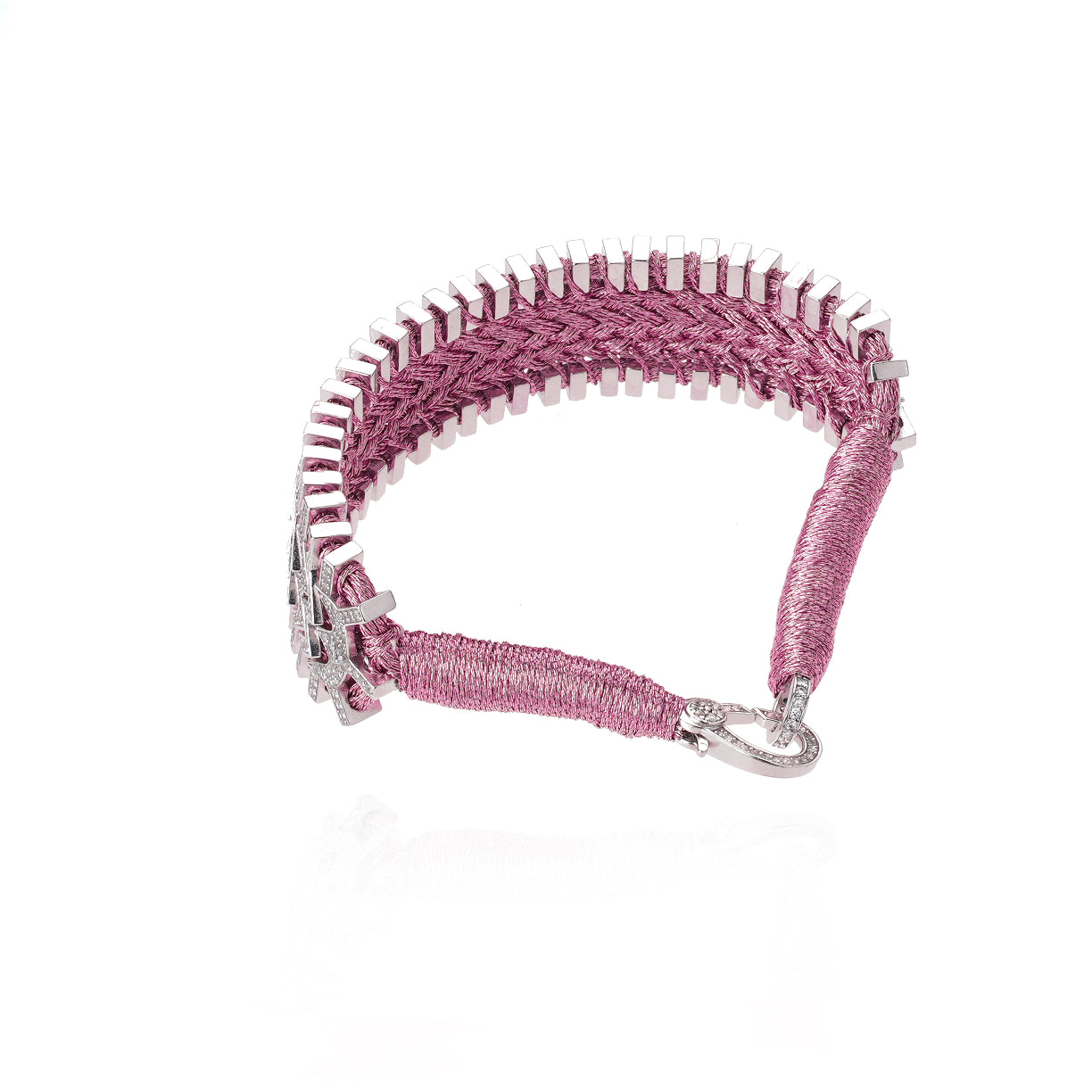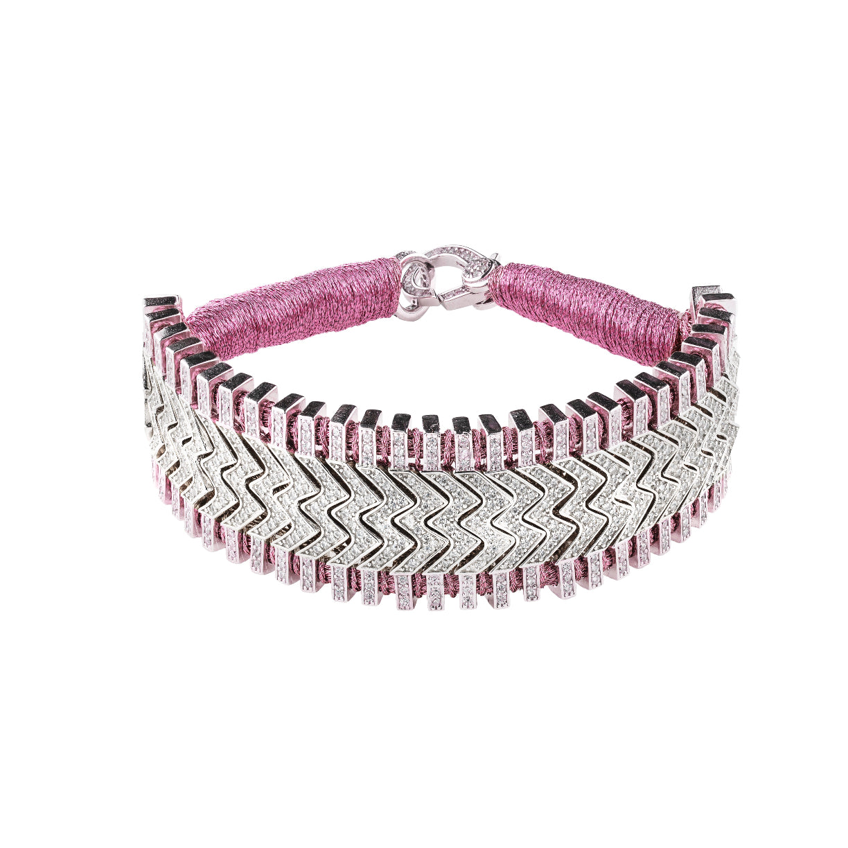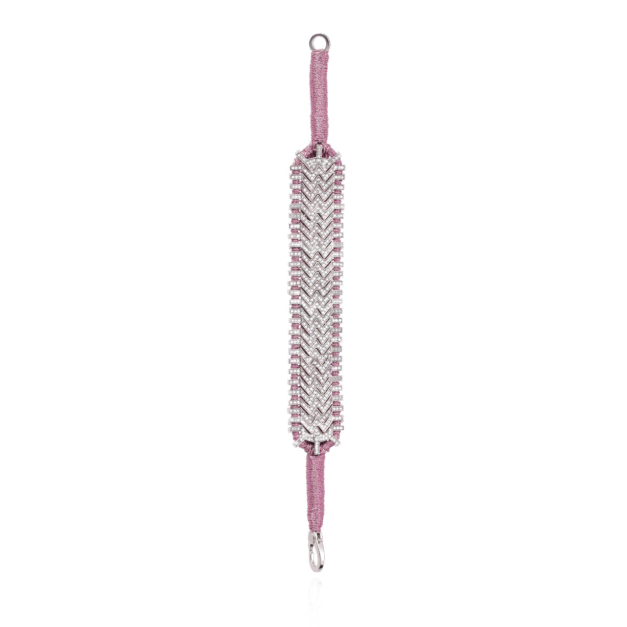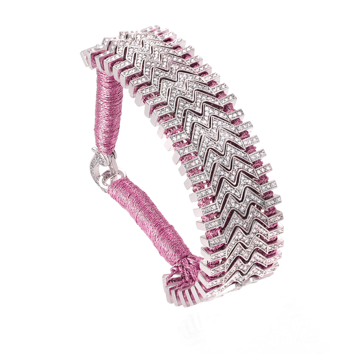 Ce sublime bracelet composé de fil couleur rose Candy est décoré d’un motif argent double chevrons, lui-même serti de plus de 400 diamants.