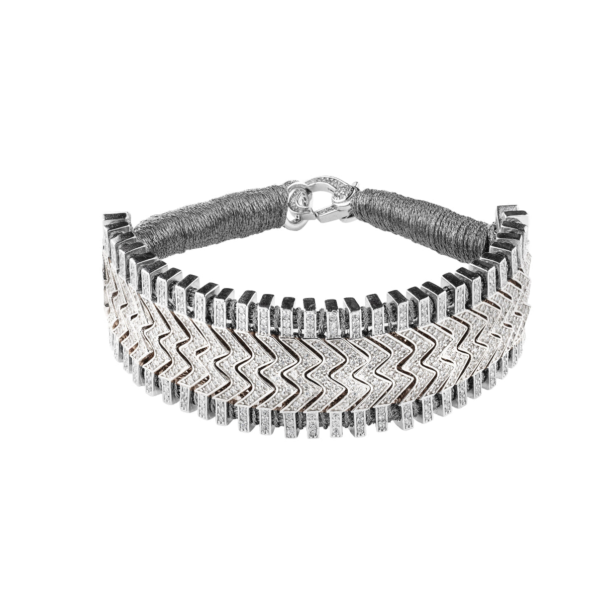 Ce sublime bracelet composé de fil couleur Gun est décoré d’un motif argent double chevrons, lui-même serti de plus de 400 diamants.