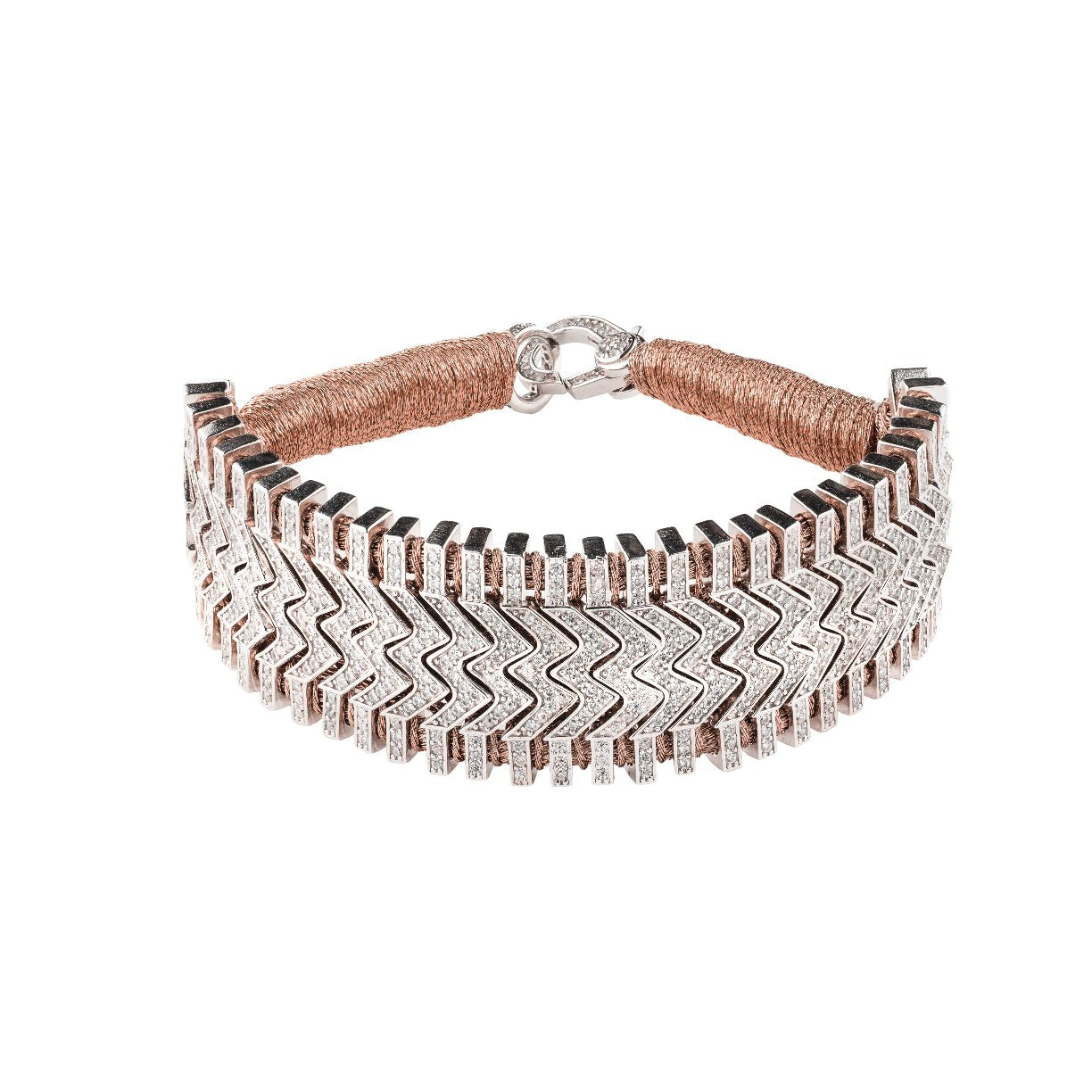 Bracelet en fil de lurex tressé de couleur rose gold décoré d’un motif en argent 925 et serti d’une multitude de diamants.