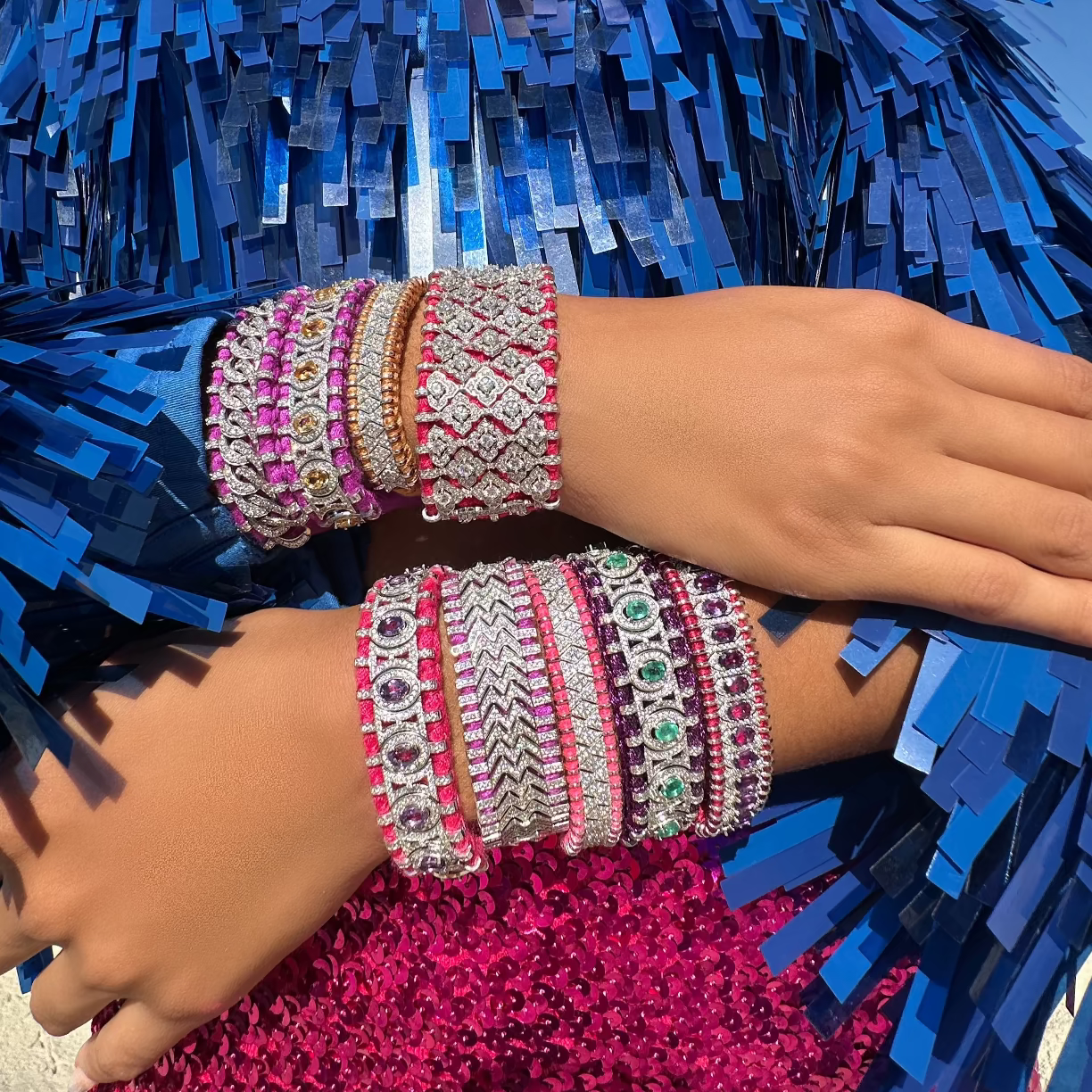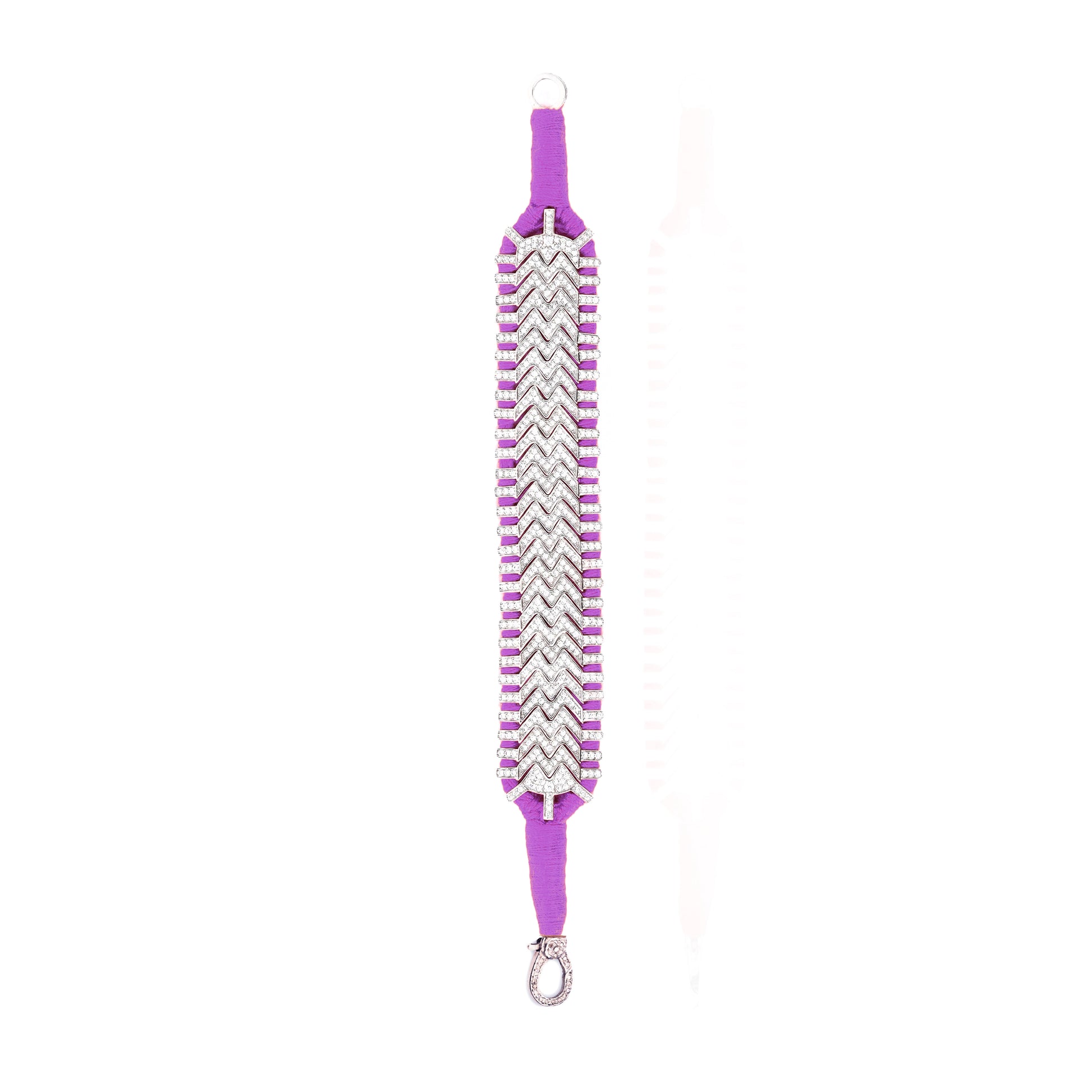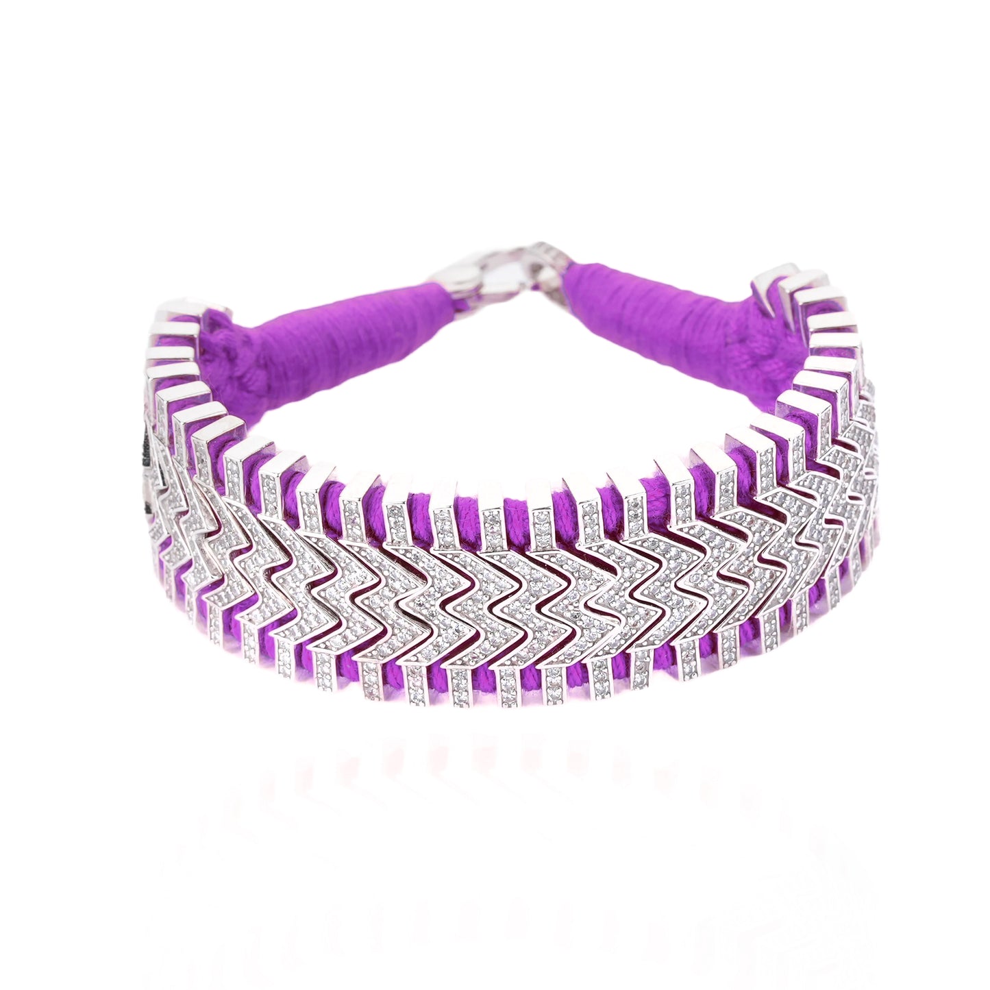 Ce sublime bracelet composé de fil violet et décoré d’un motif argent double chevrons, lui-même serti de plus de 400 diamants.