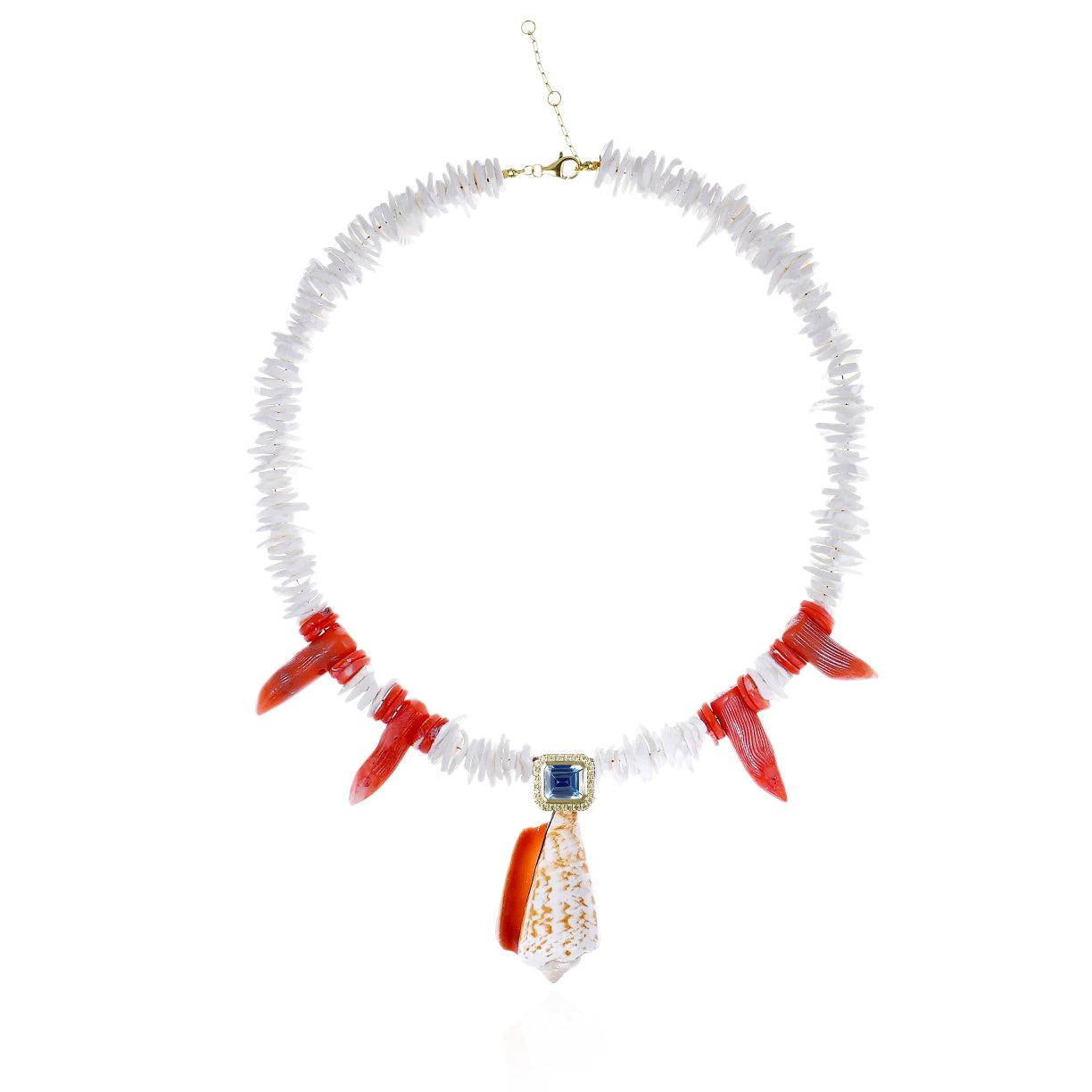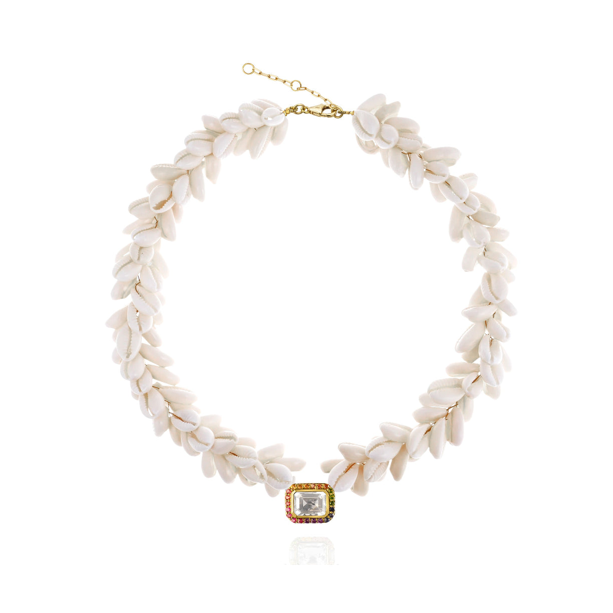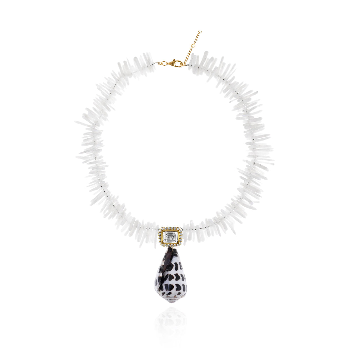 Collier en liens de coquillages avec cabochon en or 18 carats orné de diamants et d'un Cristal central ainsi qu'un coquillage suspendu.