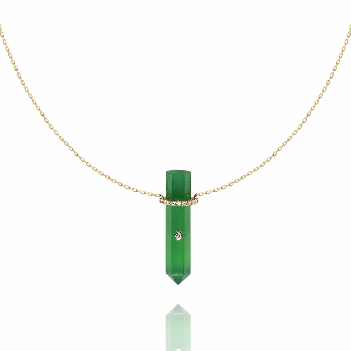 Collier en or 14 carats avec une chrysoprase centrale taillée en pointe et cerclée d'un anneau en or 14 carats serti de diamants.