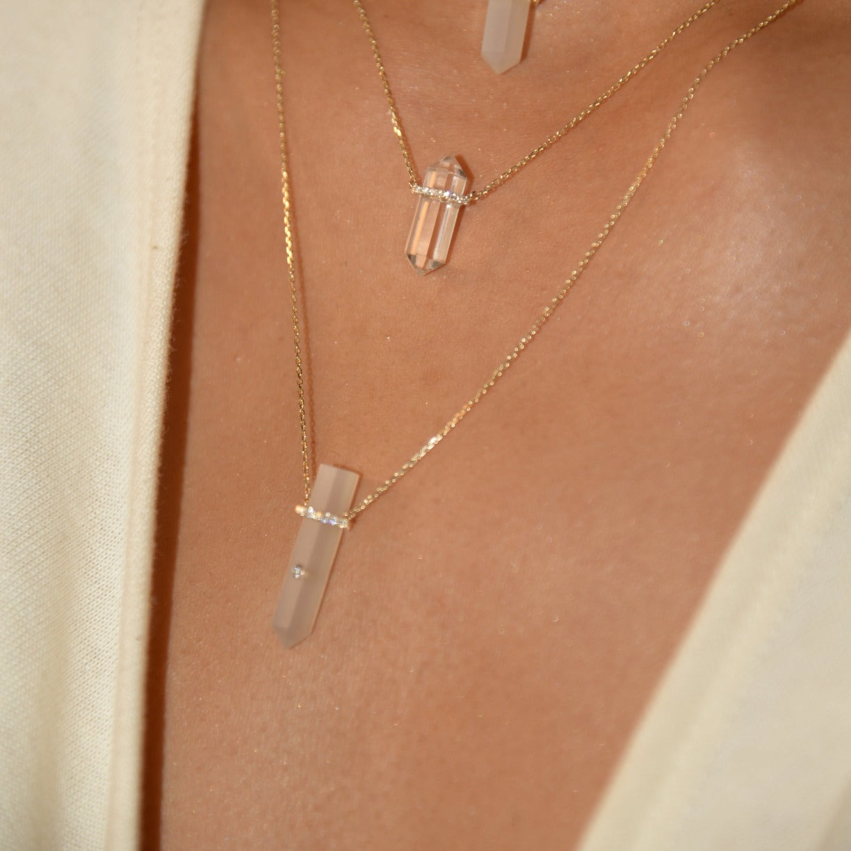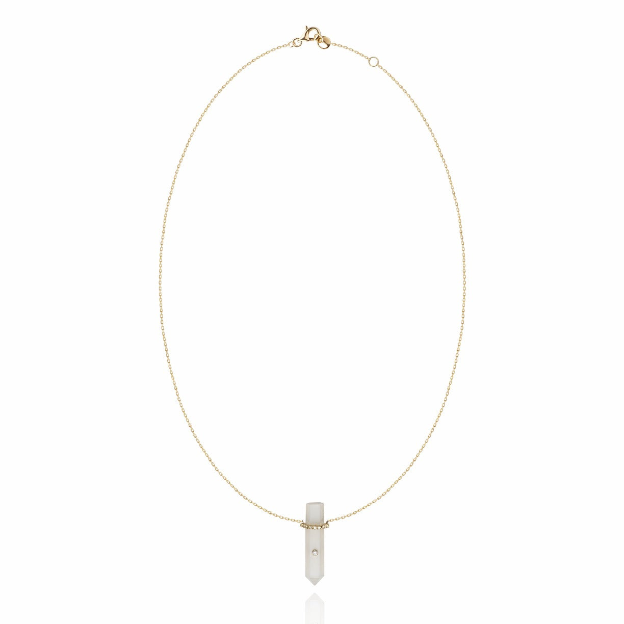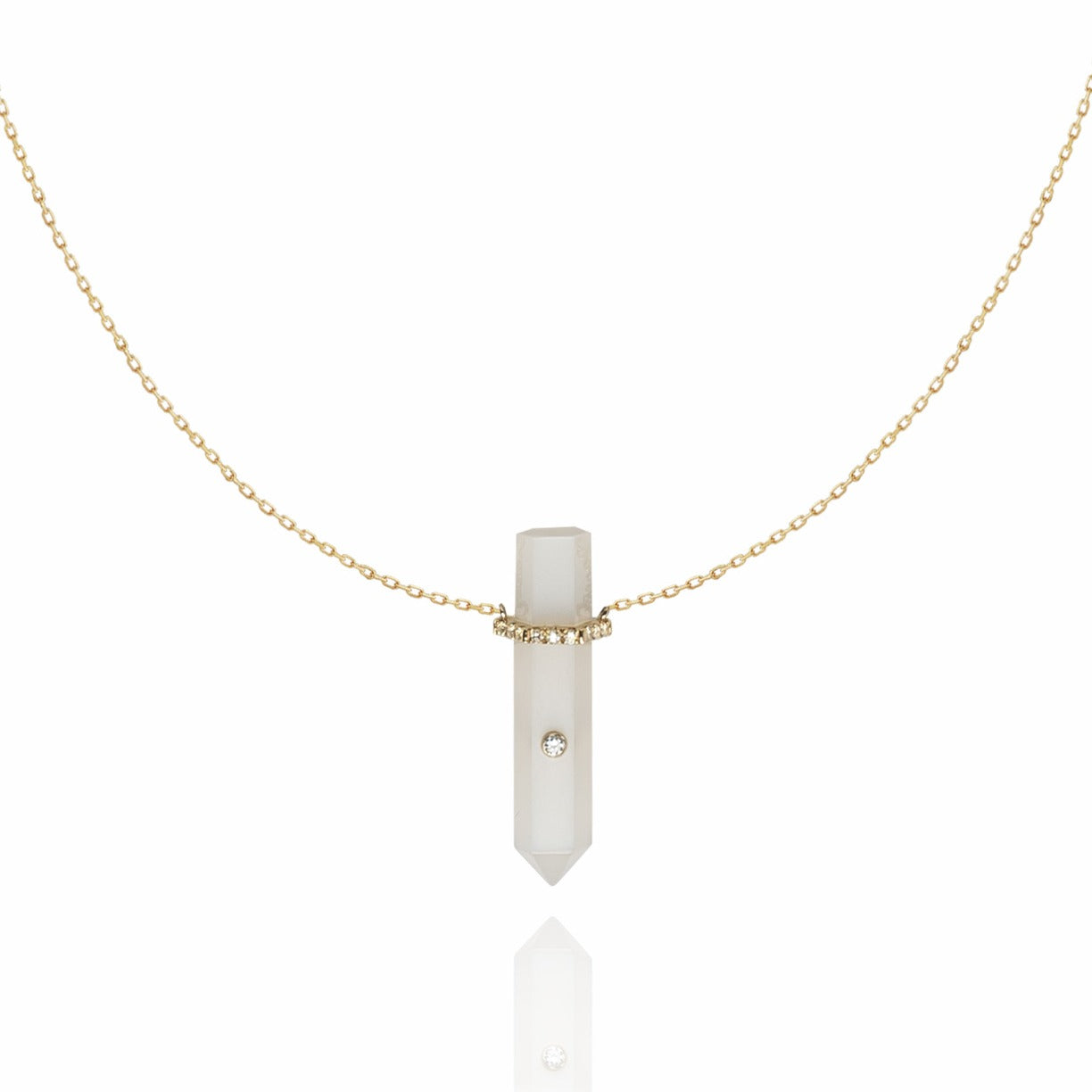 Collier en or 14 carats avec une moonstone centrale taillée en pointe et cerclée d'un anneau en or 14 carats serti de diamants.